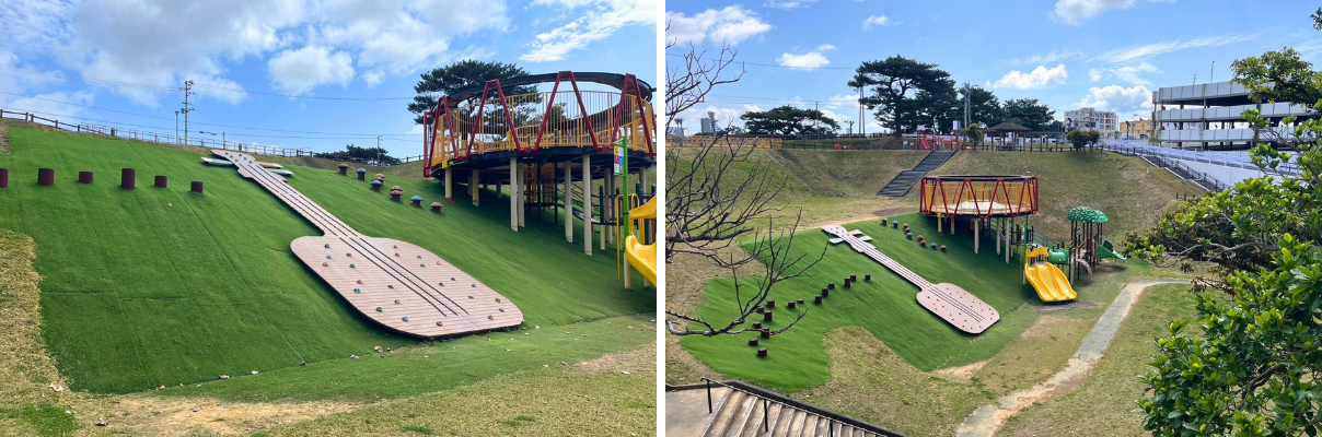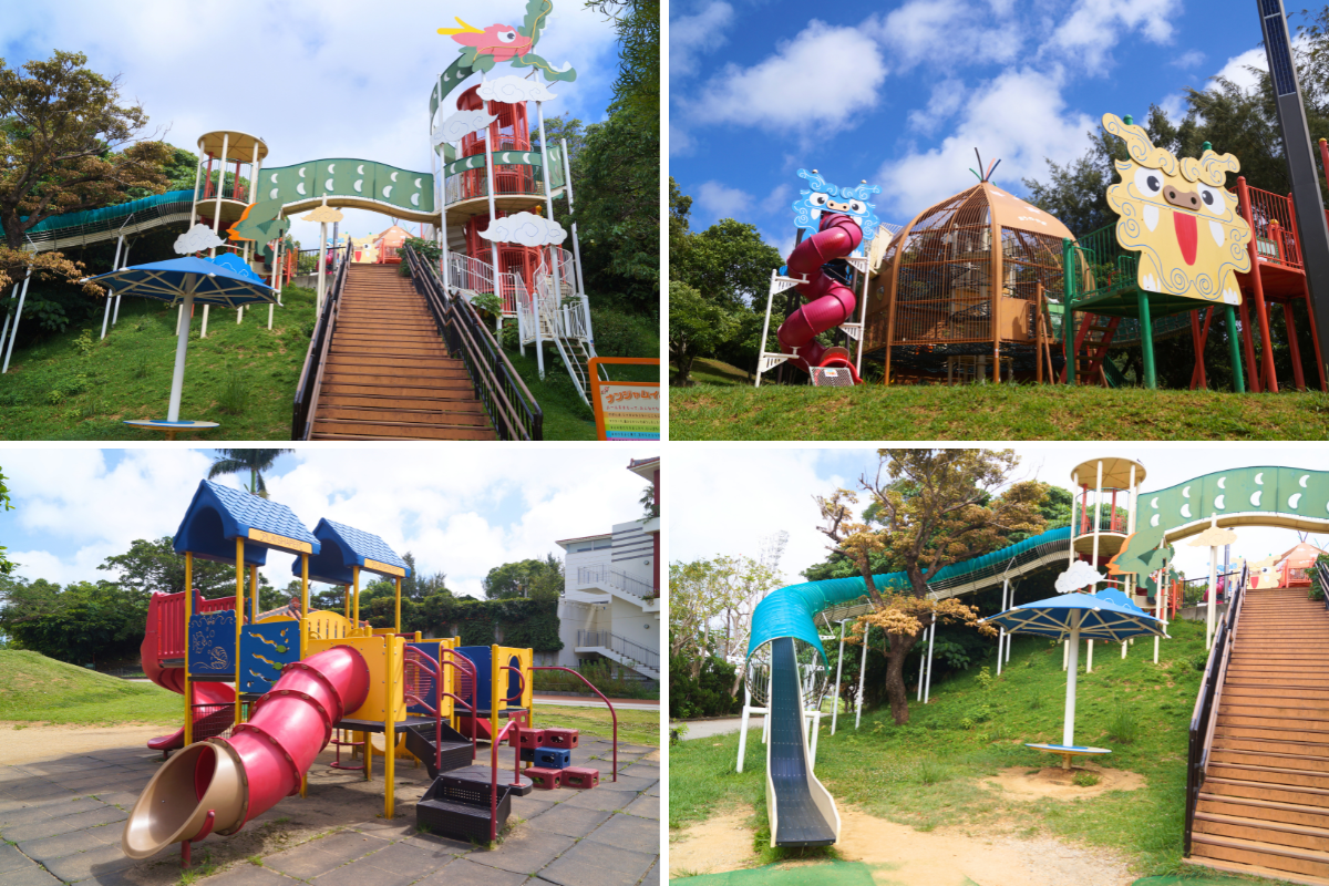 那覇市奥武山公園の中にあるナンジャムイ広場は、高台に作られた遊具が子どもたちの冒険心をくすぐる仕組みになっています。