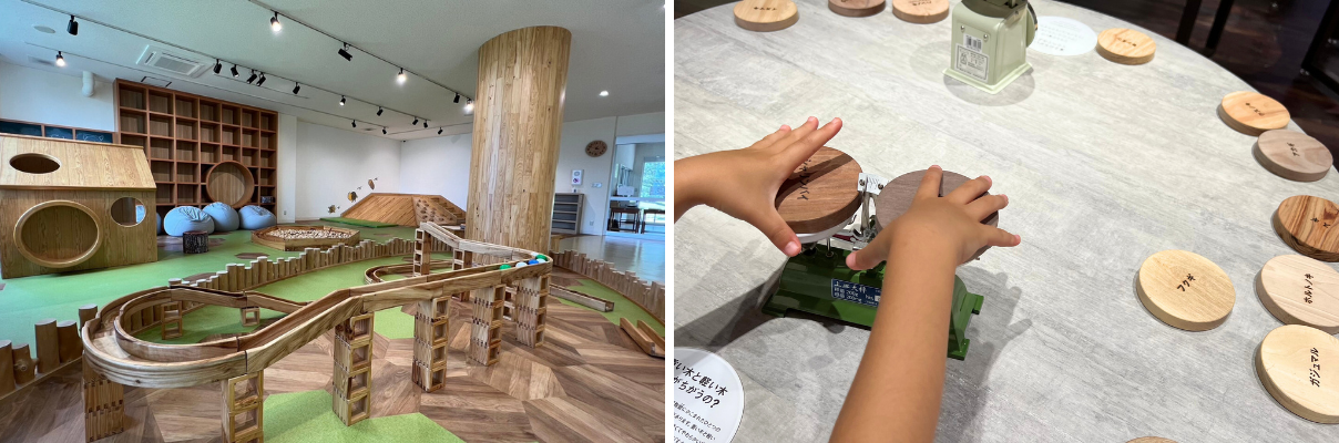 「森のふしぎ館」では、森の仕組みや木の重さの違いを触ったりしながら学ぶことができます。