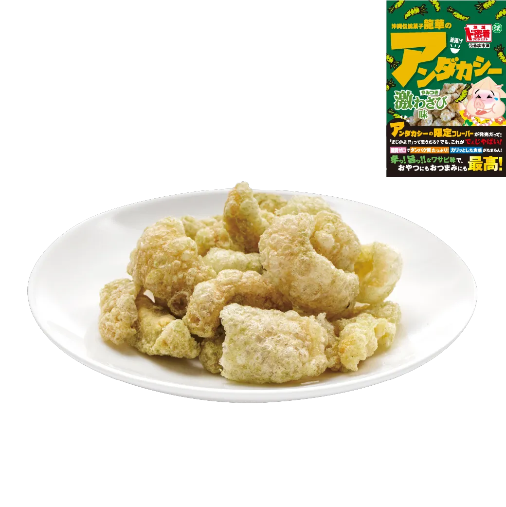 豚の皮をラードで揚げた沖縄伝統菓子「アンダカシー」。龍華の「アンダカシー」は糖質ゼロでタンパク質たっぷり!ド密着企画限定の辛旨な激わさび味はおやつにもおつまみにもピッタリ!料理のアクセントに加えるのもおすすめ!