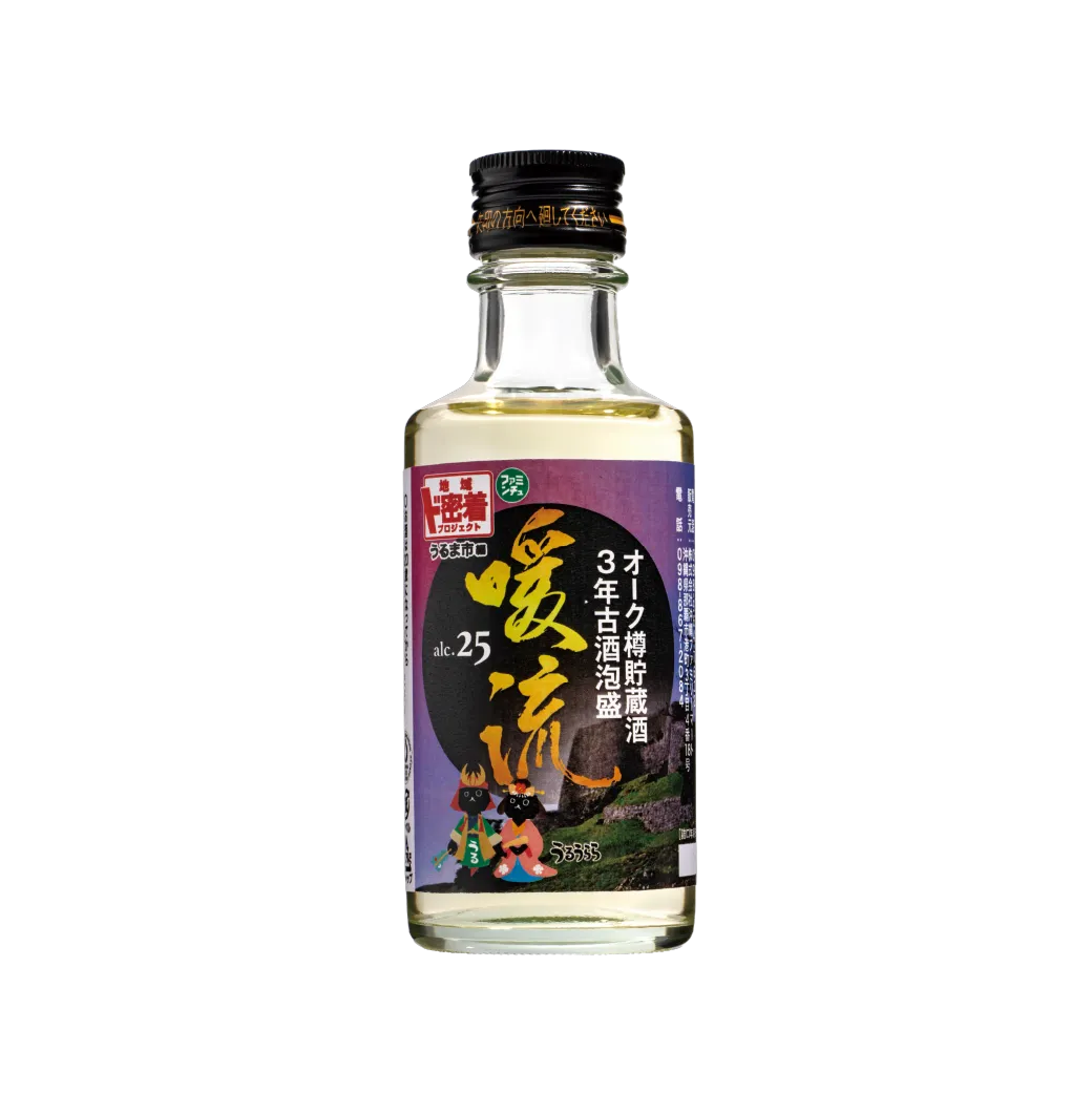 沖縄ファミマ限定販売のオリジナル泡盛。緑豊かな石川高原の麓に構える酒造所でつくられた、3年熟成のオーク樽貯蔵古酒。琥珀色特融の甘い香りと豊かなコクが特徴のオーク樽貯蔵酒3年古酒。