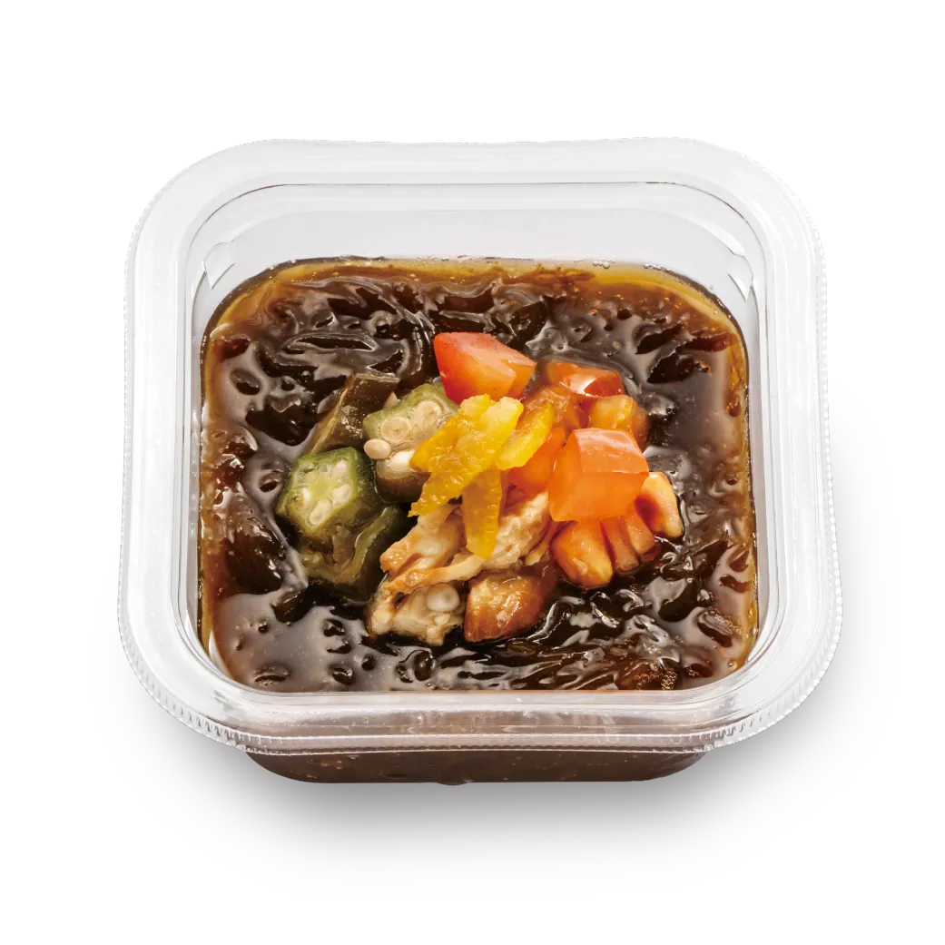 勝連産早摘みもずくを使用。もずくをボイルし、つるっと食感を再現。県民が食するシーンを想定し、馴染みのあるもずく酢風三杯酢を自社で生成。さっぱりとした味つけが特徴。