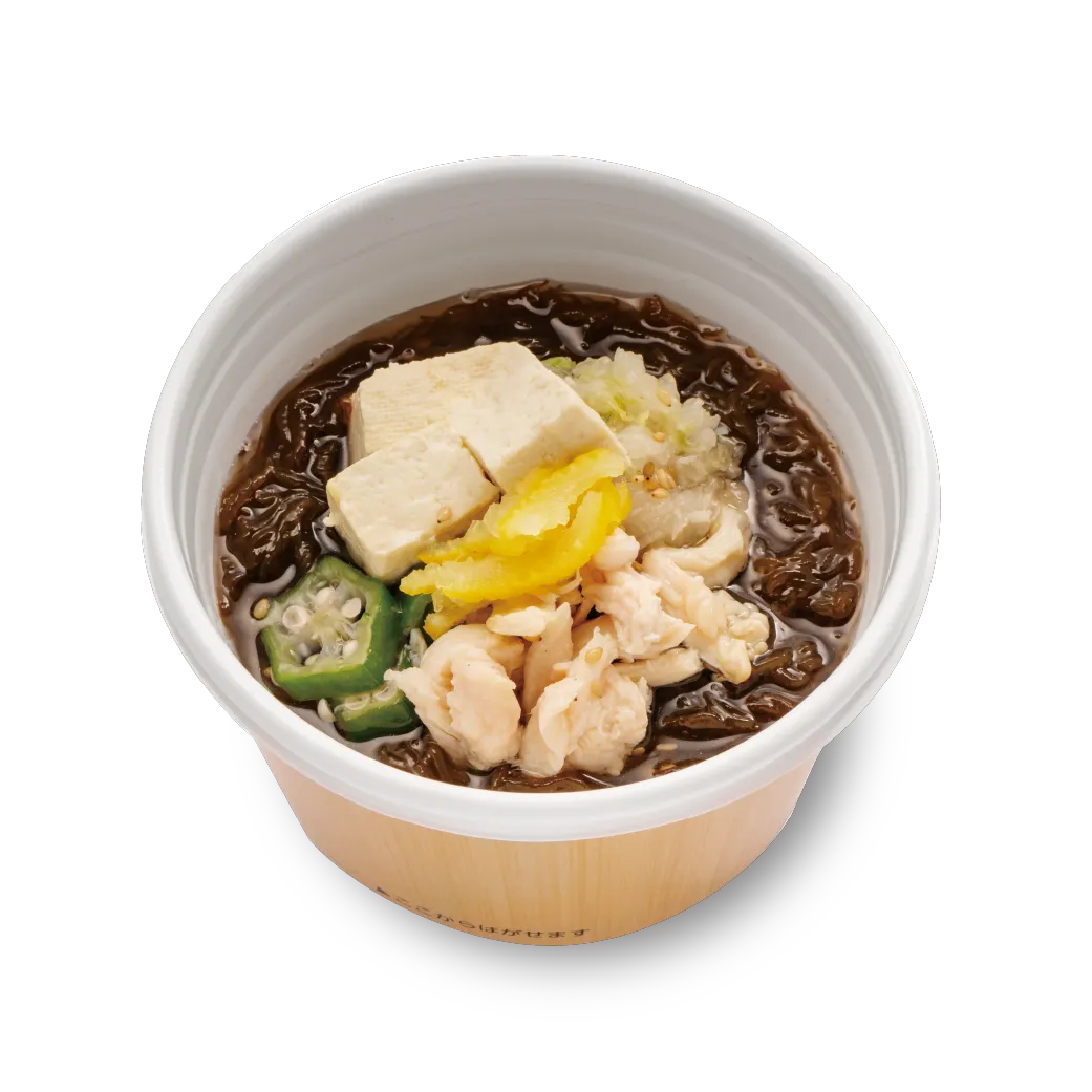 勝連産早摘みもずくを使用。勝連漁協から販売されている「新鮮!早摘み食べるもずくスープ」をベンチマーク。自社抽出の鰹出汁を使用し、スープを作成。