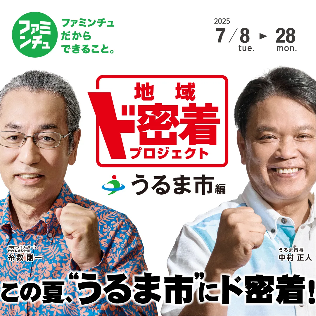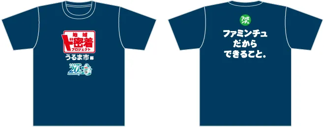 うるま市内のファミリーマート全店(25店舗)にて地域ド密着プロジェクト専用のTシャツを店舗スタッフが着用し、取組みを応援いたします。