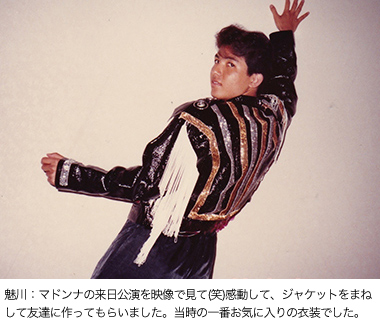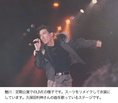 衣装は最近では、東京へ行ったときにまとめて買ったり、生地を買って仕立ててもらったりしてるんです。男性用の色鮮やかなスーツにスパンコールやビーズ、刺しゅうなどのモチーフを付けたりして、魅川憲一郎流のアレンジで味付けしてます。素敵でしょ?