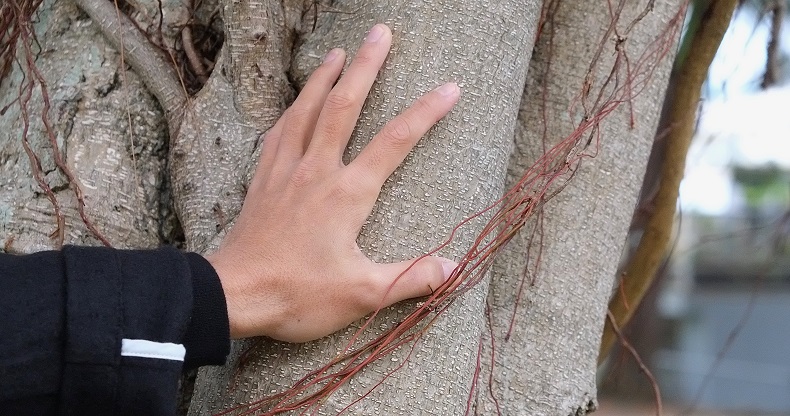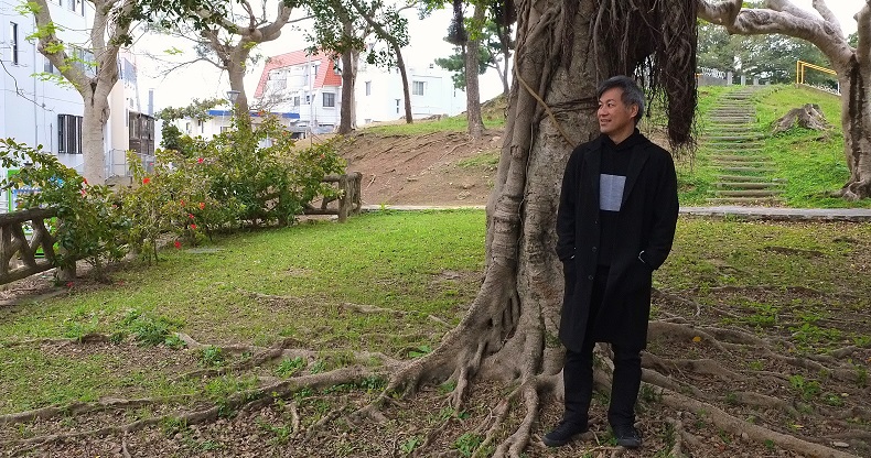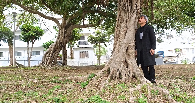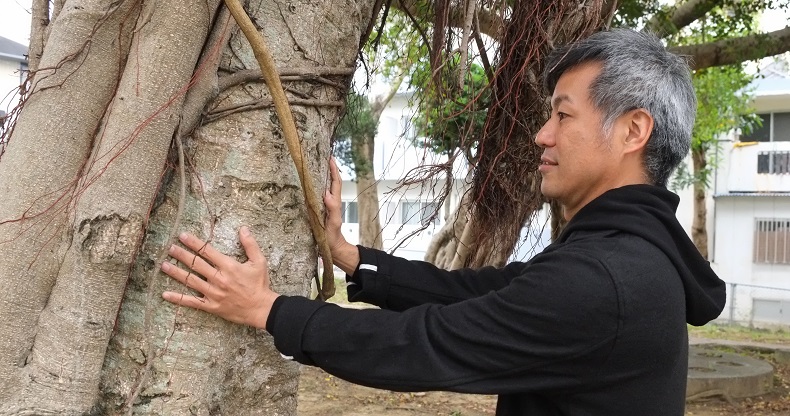 深く考えさせられるお話をしてくれた大城清太さん。インタビューを終え、「木」と並んだ写真を写させてもらった。木に触れることはよくあるのですかと聞くと、自宅近くにお気に入りの木があるとのこと。