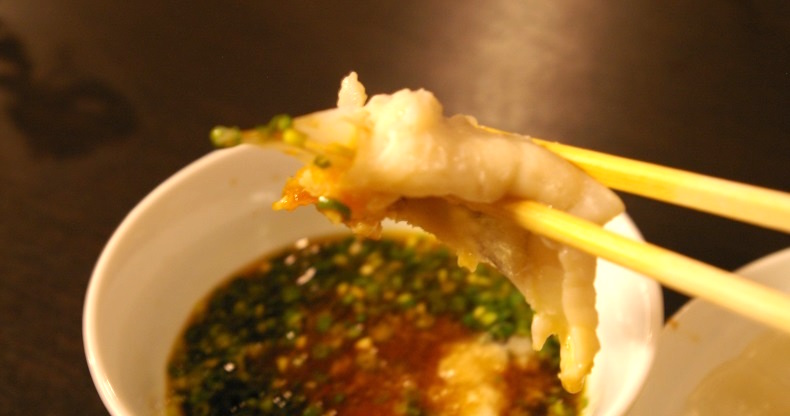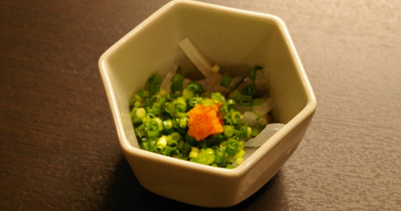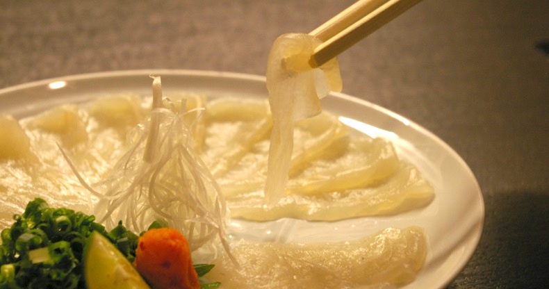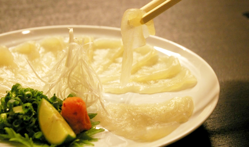 これは、ふぐの外皮をそぎ、ボイルして刻んだ料理。もみじおろしとネギ、自家製ポン酢とで和えて食べます。ふぐの外皮はコラーゲンが豊富で温かいと溶けてしまうので、ヒンヤリしているうちが食べ時。