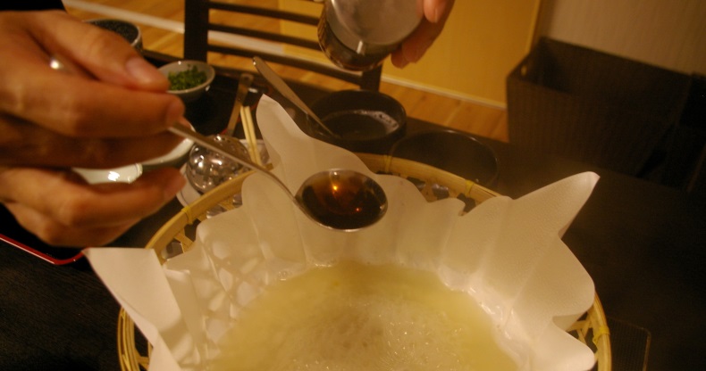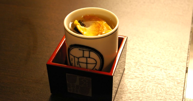 次の料理に進む前に、ふぐ料理店で欠かせない飲み物「ひれ酒」のご紹介。