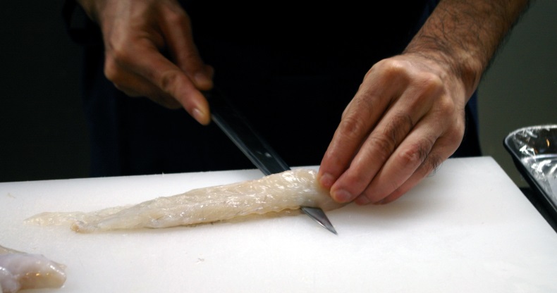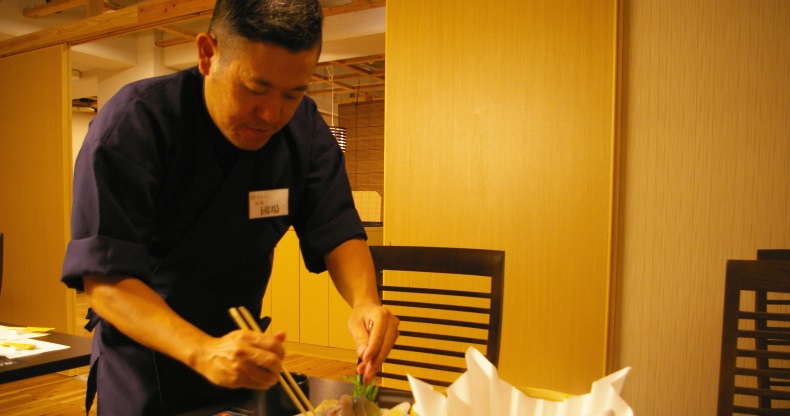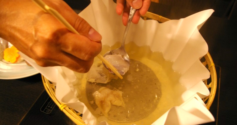 ふぐは身離れが悪い魚なので、しっかり火を通してほぐしやすいように調理します。素人にはこの火の入れ加減が難いので、ここはプロにお任せを!お店の方が最初はていねいに調理してくれます。今日は店長の國場匠さんにお願いしました。