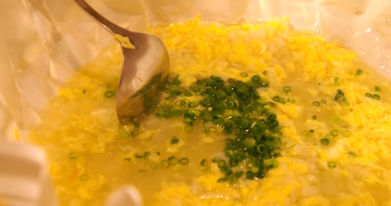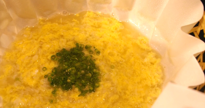 スープにご飯を投入し、自家製の雑炊用醤油で軽く味を付けます。そして卵を溶き入れ、待つこと数分…。
