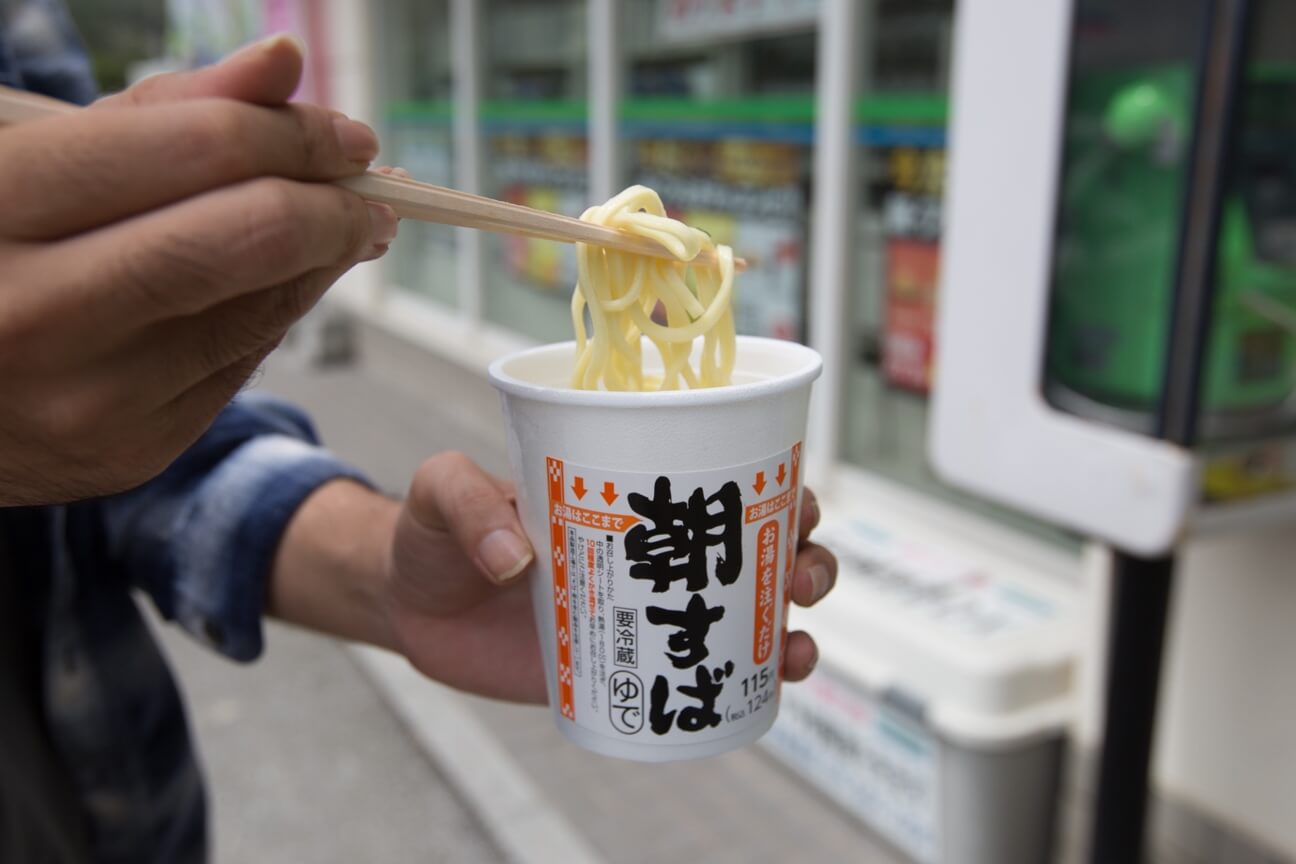 早速朝から士気を高めるのにぴったり。県民のソウルフード「朝すば(124円)」で腹ごしらえします。