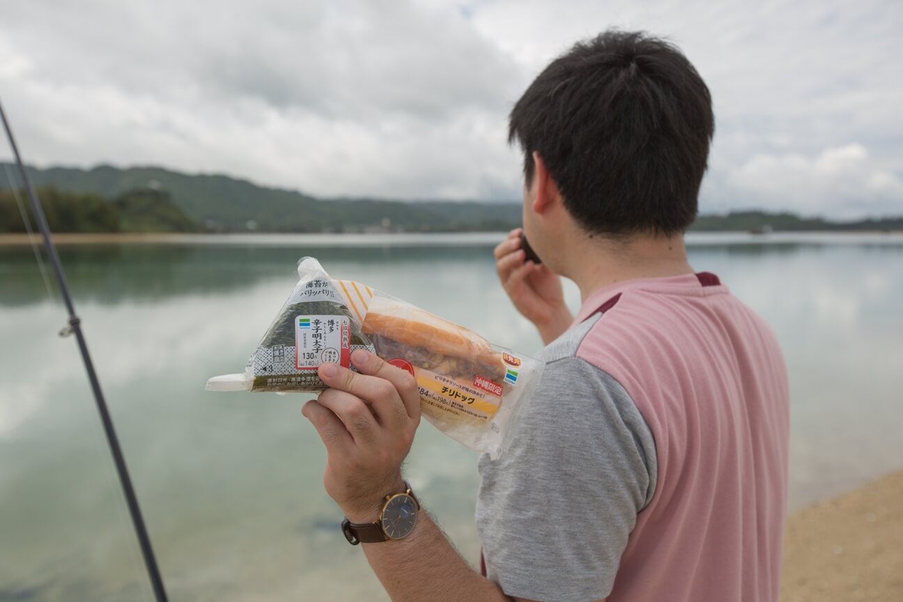 いつ引きが来るか分からず、竿から目が離せない中、お腹が空いても、このように美味しさとエネルギーを片手でチャージできます。 (今回はおにぎりとチリドッグ)