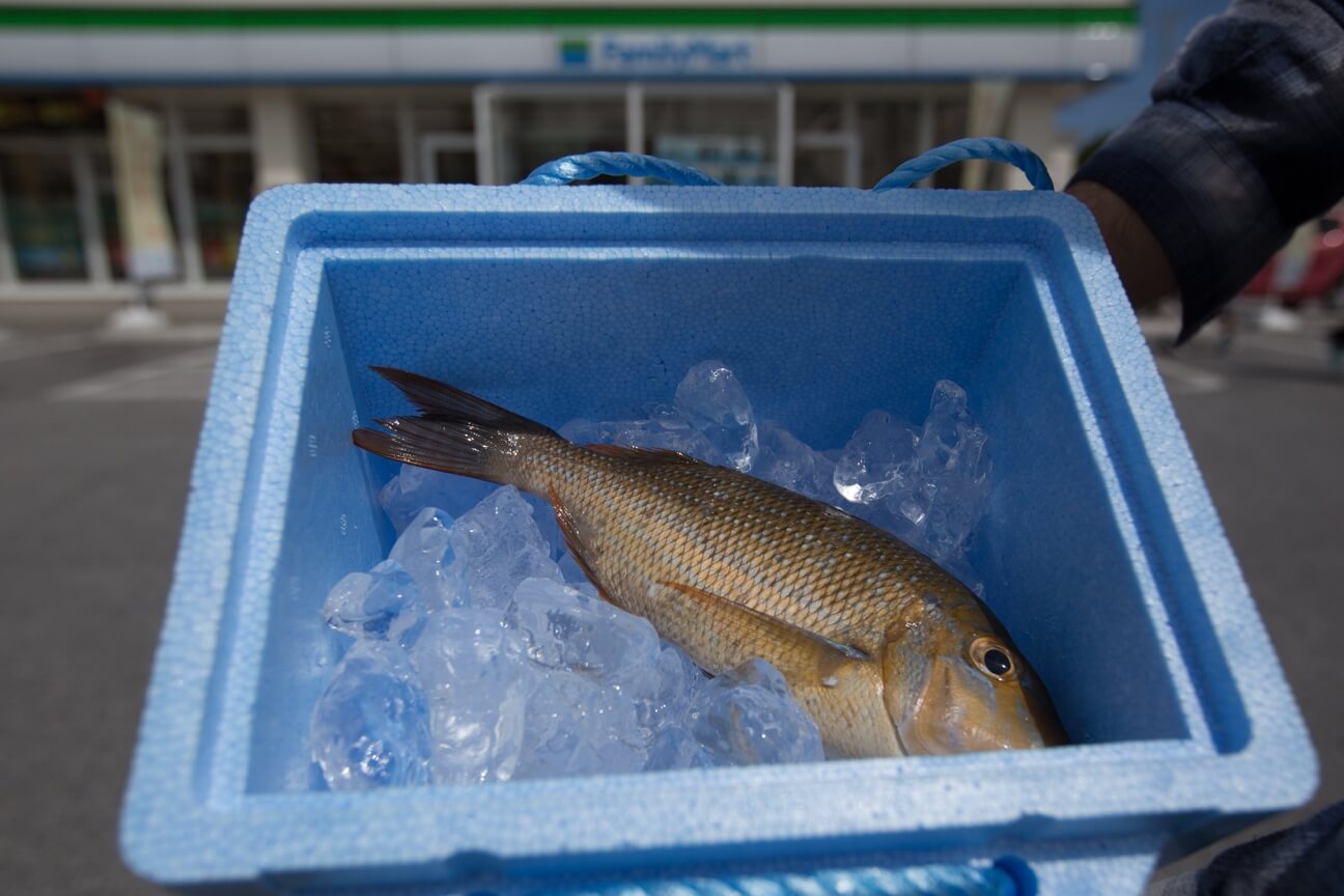 ファミリーマート読谷とや店で販売していたクーラーボックスに氷を入れて、鮮度を落とさずに持ち帰ることができます。