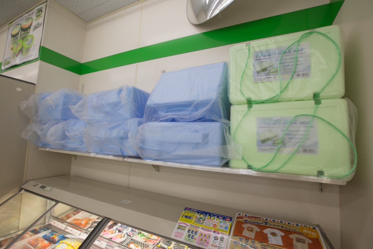 氷コーナーのそばには、魚を持ち帰るときに用意しておきたいクーラーボックスも置かれています。