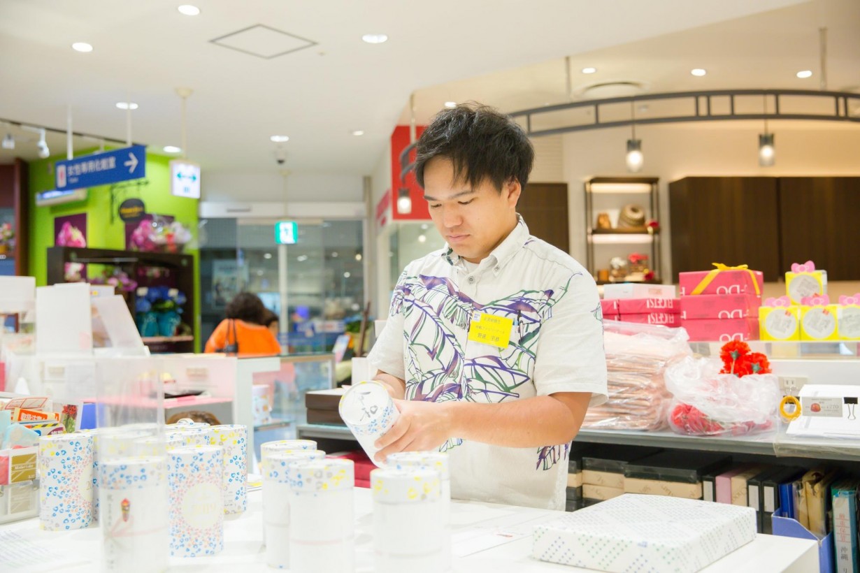 1階フロアは、デパートリウボウ内の顔となる場所。外国のお客様も多いこのフロアでは、どんなお客様が何にどう反応するかを見る絶好の機会になります。こちらでは藤野さんと野甫さんがそれぞれ別々の銘店売場にて包装の練習を行いました。包装はクオリティとスピードの両方が求められる難しい作業。コンビニでは丁寧に包装するという機会がないため、2人とも真剣な顔つきで包装を行っていました。
