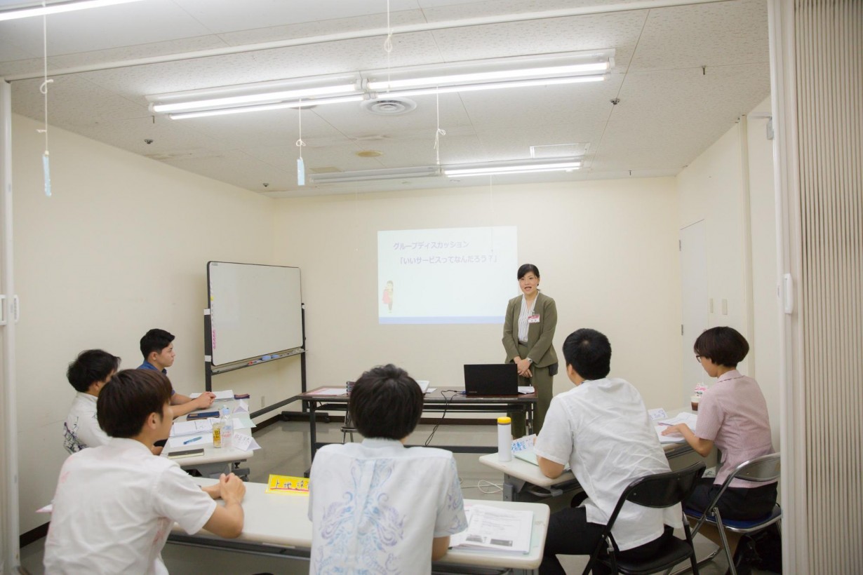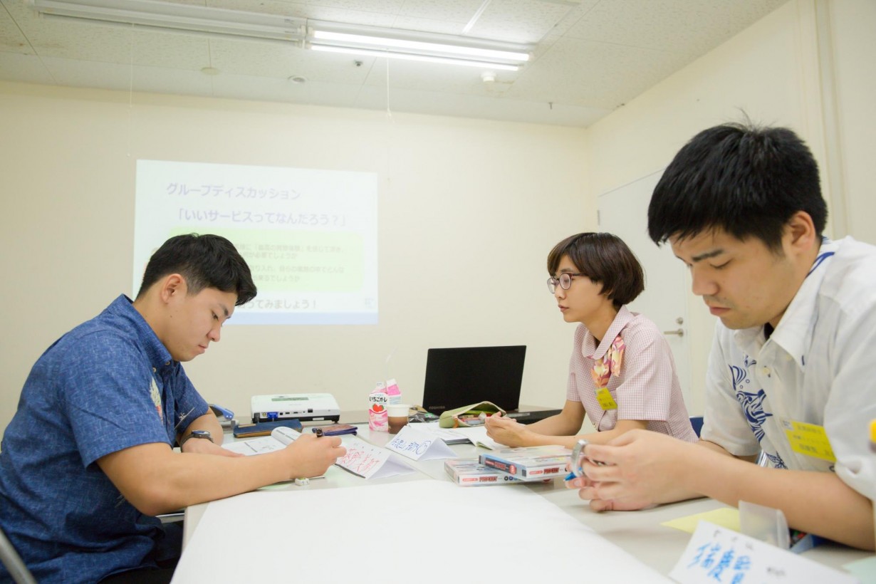 それぞれ「ソフト面」(人やサービスなど形のないもの)と「ハード面」(設備や環境など)双方の側面でレポートを提出するのが今回の課題。役割分担を決め、話し合いから発表まで定められた時間の中で取り組む研修の集大成、グループディスカッションのスタートです!