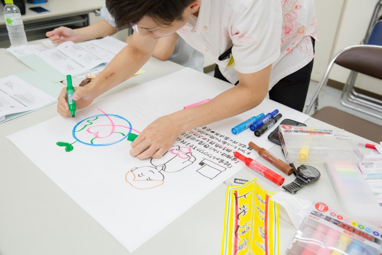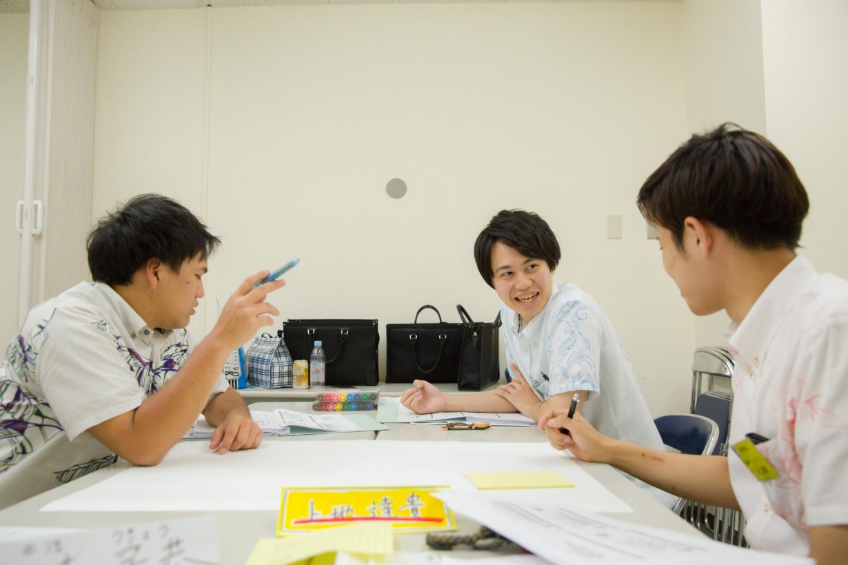 瑞慶覧さんが文字を書き、藤野さんが下書きを消し、佐渡山さんがイラストを描くという連携プレイ。全ての役割に対して、全員が積極的に関わっていく姿が印象的。