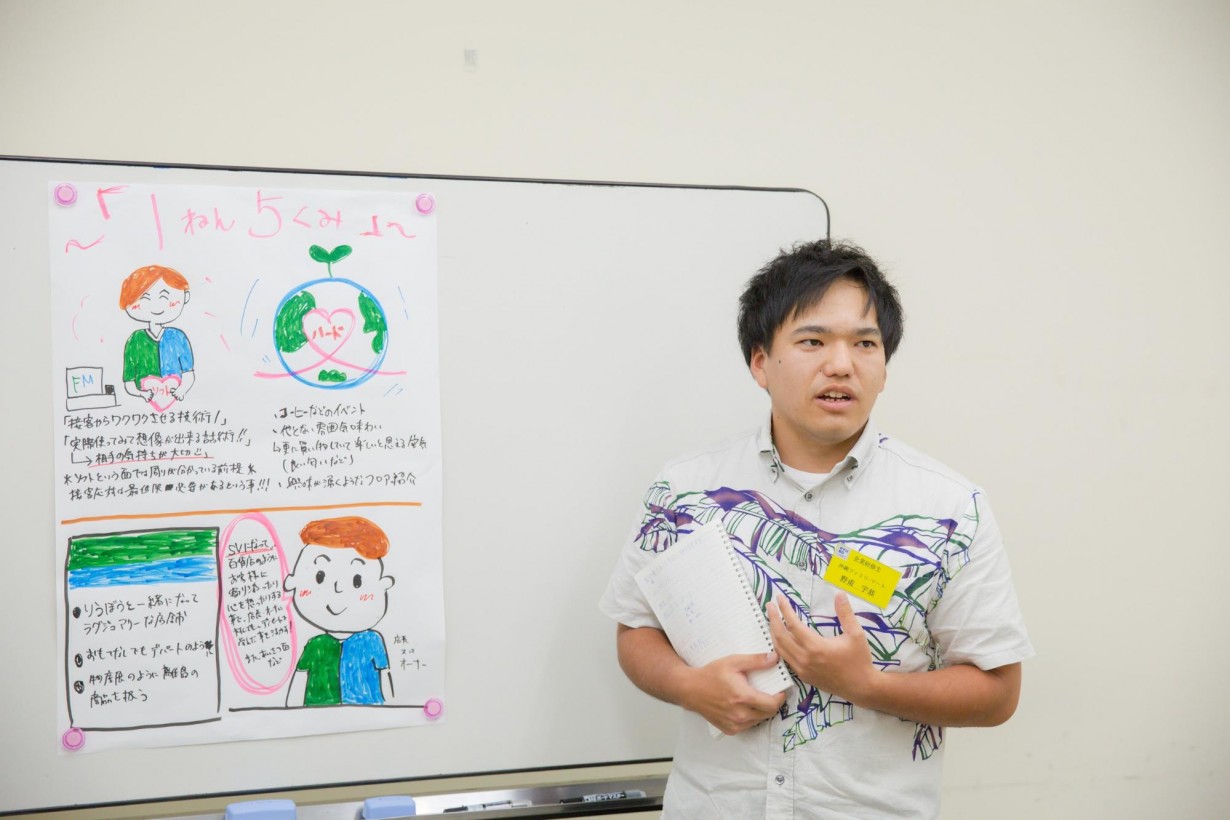 絵を描くのが得意な上地さんが、驚くべきスピードで、まとまった内容を図式化していきます。発表役の野甫さんも「まとめるのは、彼にまかせておけば安心です!」と厚い信頼を寄せます