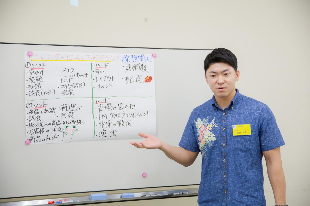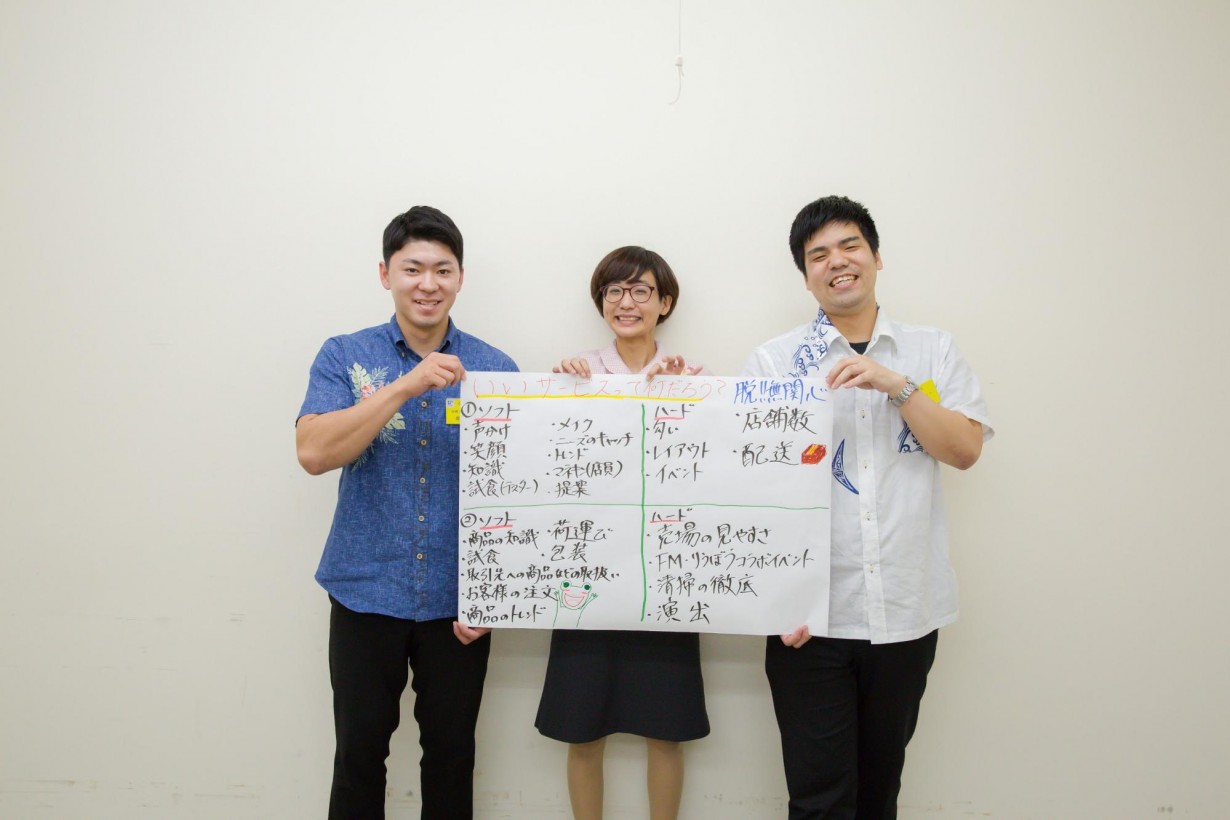 宮里さん「皆さん研修の主旨を理解してくれて、何を学び、何を持ちかえればいいかを理解し、まっすぐに取り組んでくれたので、とてもやりやすかったです。これからリウボウグループを引っ張っていってくれる頼もしい人材だなと思いました。そして私自身も刺激を貰うことができました。百貨店にずっといると、百貨店基準で考えてしまいがちなのですが、若手のフラットな接客が好まれるシーンもあったりと、私も勉強させていただきました」