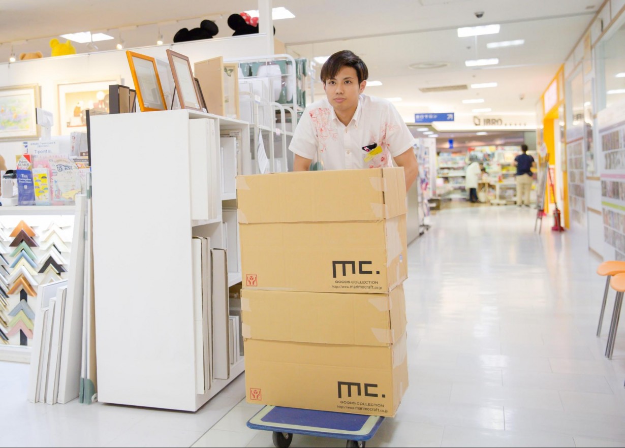 大量の商品を倉庫に運ぶ上地さん。重そう・・