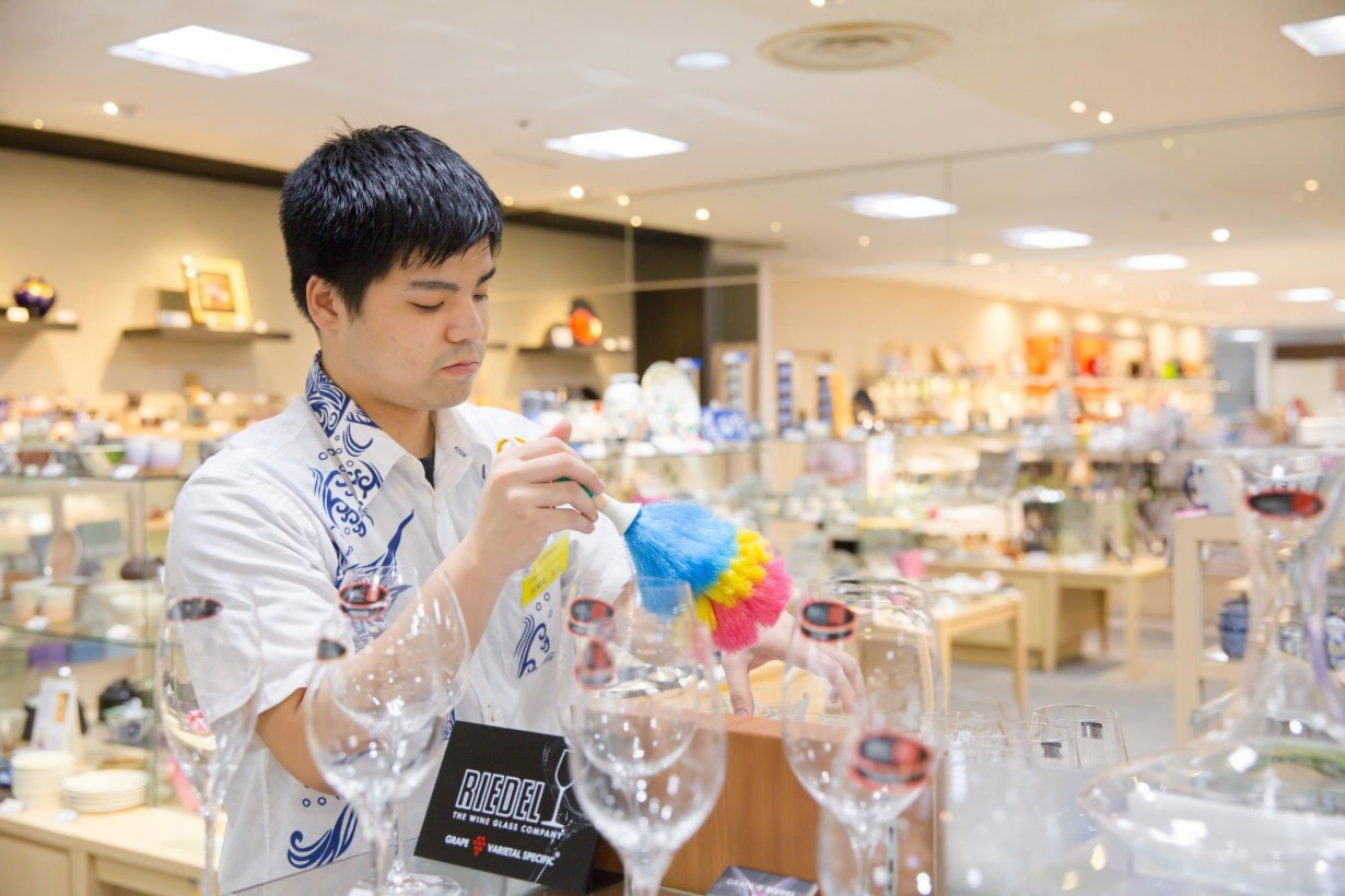 高級品を割ってしまわないよう、丁寧にほこりを取る瑞慶覧さん。掃除を行いながら、商品の知識を教わるのも研修の一環