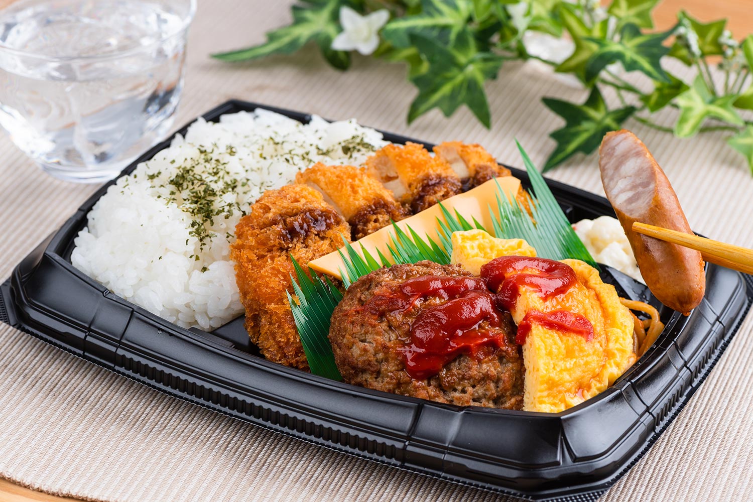沖縄の食堂で定番メニューのAランチを弁当で再現しました。ボリュームのあるチキンカツに、ハンバーグ、玉子焼き、ウインナー、ナポリタン、ポテトサラダをトッピングしました。