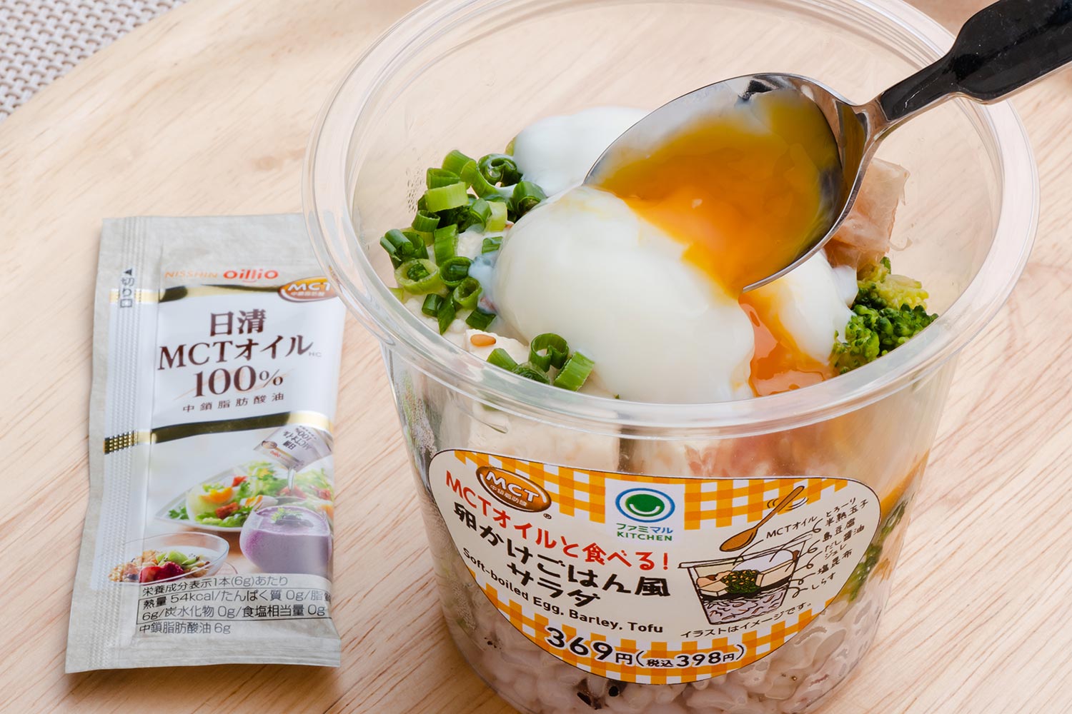 MCTオイルと食べる!卵かけごはん風サラダ 398円(税込)もおすすめ。