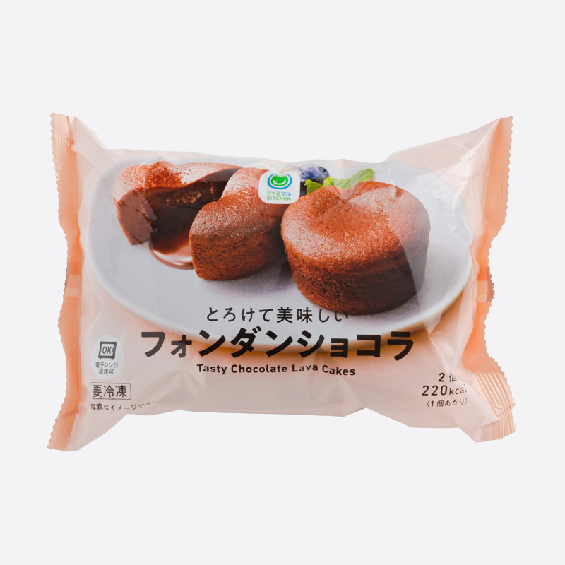 ファミマルKITCHEN冷凍スイーツ・ブレッドシリーズ。クーベルチュールチョコ使用の濃厚な自家製ガナッシュが入ったフォンダンショコラです。レンジで温めることでとろっととろけたチョコの食感も楽しめます。2個入り。※数量限定です。