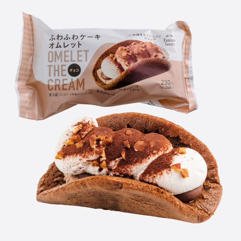 濃厚な生チョコとチョコレートクリーム、北海道産生クリームをブレンドしたくちどけのよいホイップをこだわりのふわっふわオムレット生地で包み、ナッツとココアパウダーをトッピングしました。