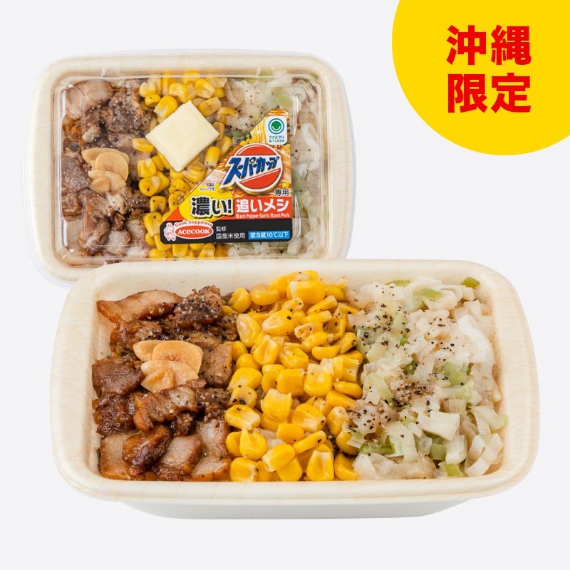 【エースコックコラボ商品】ガーリックバター醤油ご飯の上にチャーシュー、コーン、炒め白ネギ、最後にブラックペッパー、カットバター、フライドガーリックをトッピングした、スーパーカップに合う濃いお弁当です。
