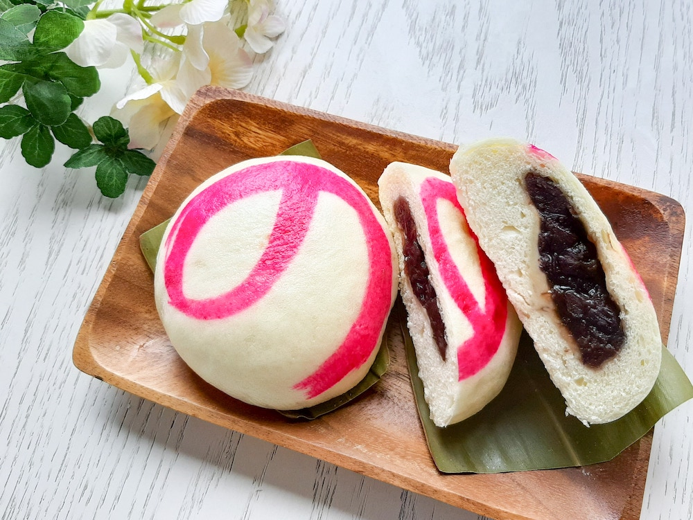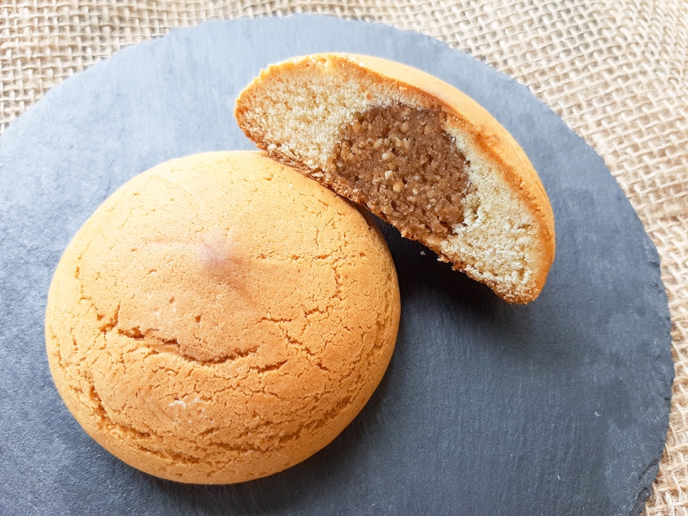 “の”は熨斗(のし)を意味していて、縁起物としてお祝いの場でよく配られています。ふかふかの生地はほんのり月桃の香り、そして中には粒あんがたっぷりと入っていています!