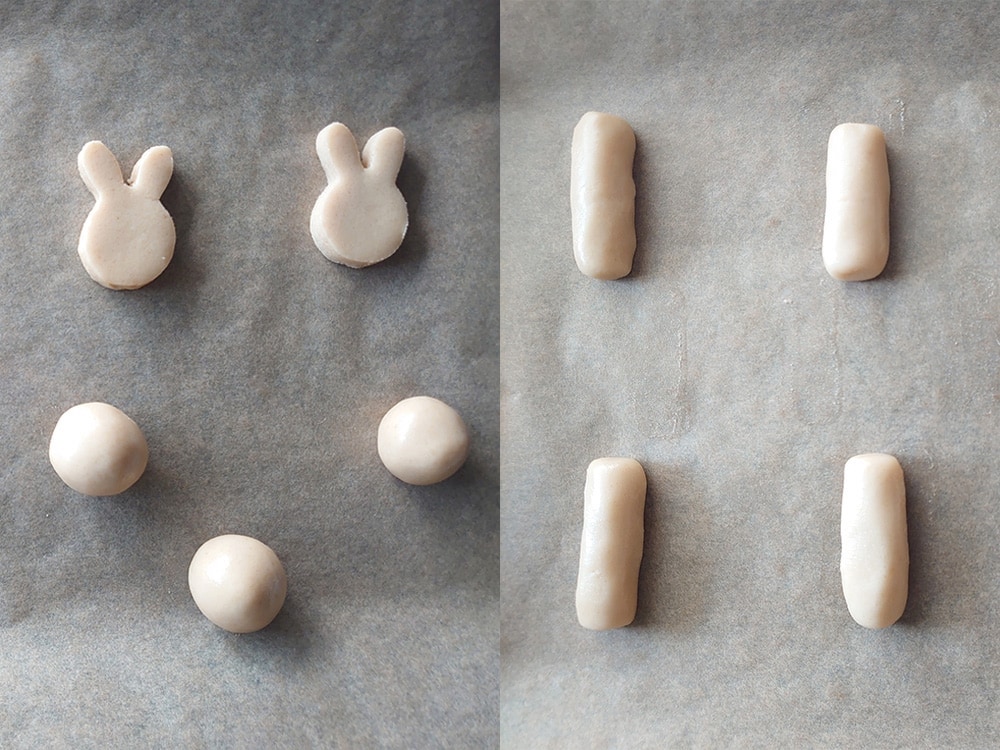 ③生地を1cmくらい(クッキーより少し厚め程度)の厚さに伸ばし、小指の形くらいに形成したり、お好みのクッキー型で抜いたりして、クッキングシートを敷いた鉄板の上に乗せる。
