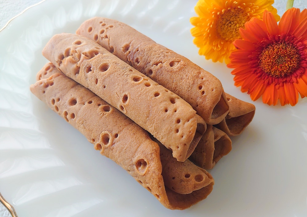 沖縄版のクレープともいわれる「ちんびん」は、黒糖の入った薄い生地をくるくると巻いた焼き菓子です。