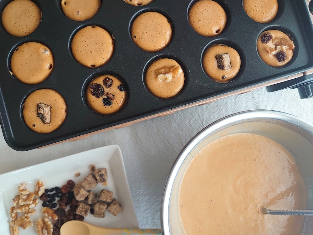 ②生地を入れた穴のうち半分に、入れたい具をランダムで入れる