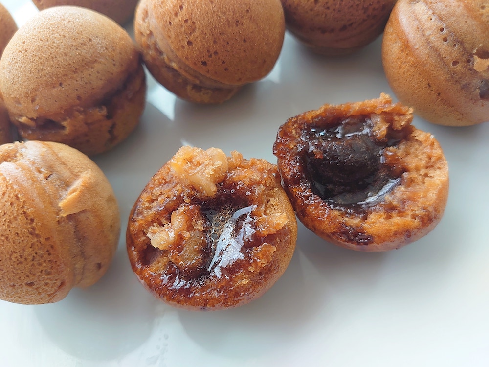 ①ちんびん生地を作り(手順は基本レシピと同じ)、たこ焼き器の穴8分目まで生地を入れる。