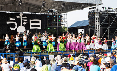 今回初の試みとなる「フラの部」では、BEGINがバックバンドを務める中、フラダンサーのみなさんがステージだけでなく観客席にまで広がって、優雅な舞を披露。琉球國祭り太鼓も登場し、フラとエイサーの見応えのあるコラボ!ハワイから沖縄へバトンタッチされたステージは、力強いエイサーと共に、BEGINのヒット曲「三線の花」「島人ぬ宝」を披露。