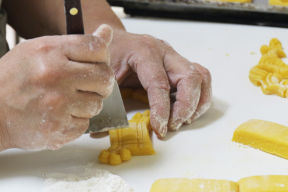 「花ぼうる」の材料は卵黄、砂糖、小麦粉の3つと非常にシンプル。油類や保存料などが入っておらず、先ほどの言葉どおり伝統的な製法が守られています。それらの原料を贅沢に混ぜ合わせ、まずは手のひらほどの長方形の生地を作ります。そこから、1枚1枚丁寧に花をかたどった切り込みを入れていくんです!