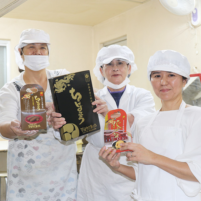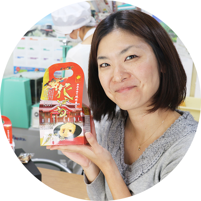 琉球王朝時代に王府の包丁方を任されていた、新垣親雲上淑規(あらかきぺーちんしゅくき)の流れを組んでいる、由緒正しいお菓子屋さん。「昔からの味は絶対に変えてはならない」との言葉を胸に、伝統的なお菓子づくりを守っています。だからこそ、お店の看板メニューである「ちんすこう」も「くんぺん」も、もちろん「花ぼうる」もすべて手作り。