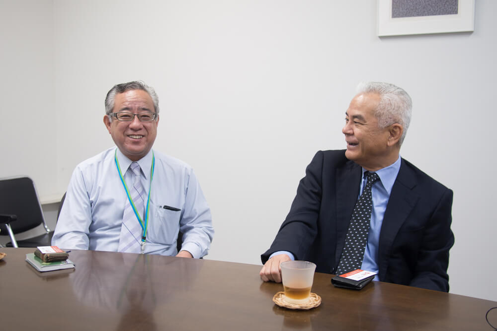 今回も前回に引き続き創業当時のことを知る橋口和久さん(眼鏡のかた)と當間重政さん(ジャケットのかた)に当時のお話をうかがった。