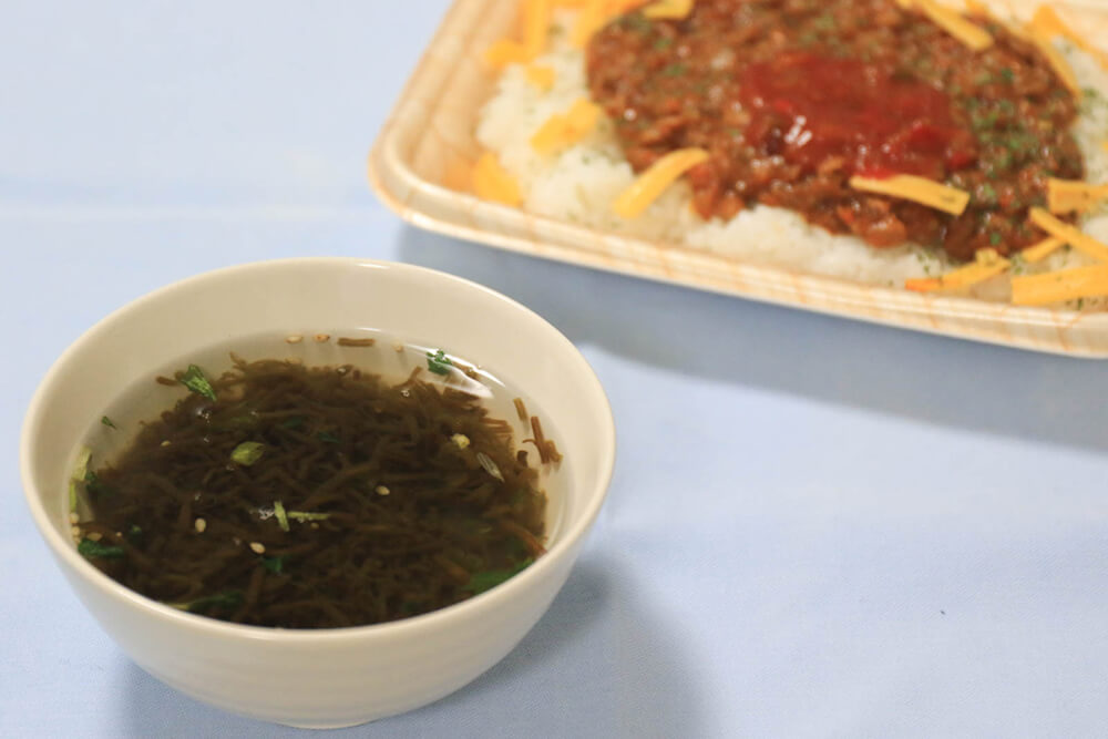 勝連のもずくをふんだんに使った「新鮮早摘みもずく たっぷり食べるスープ」。