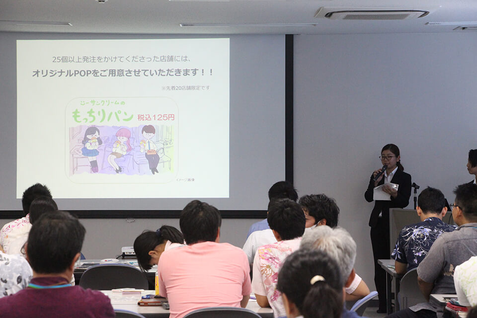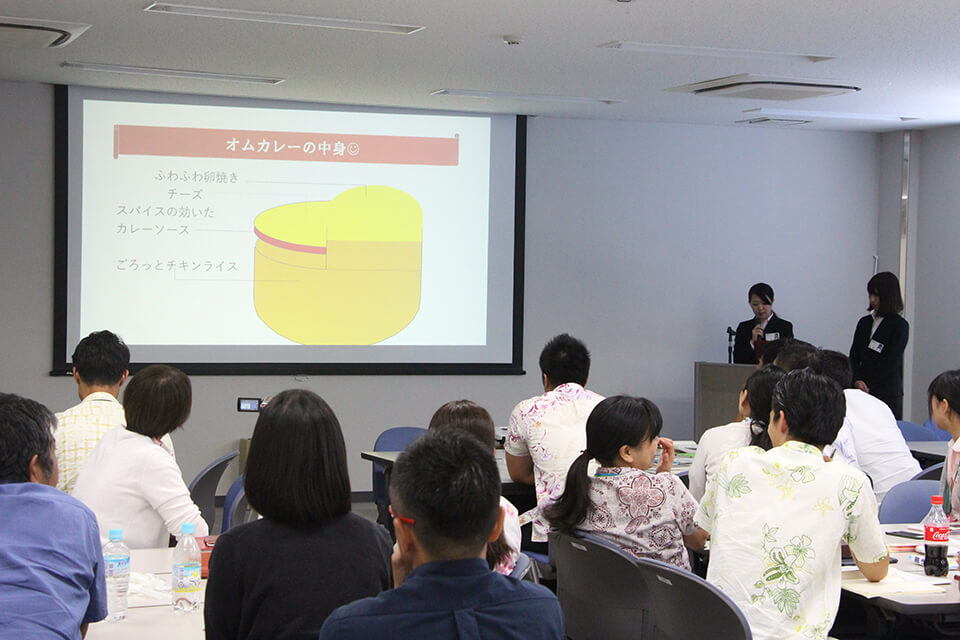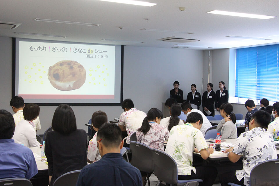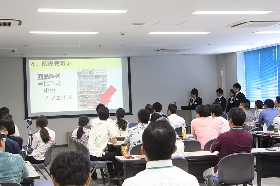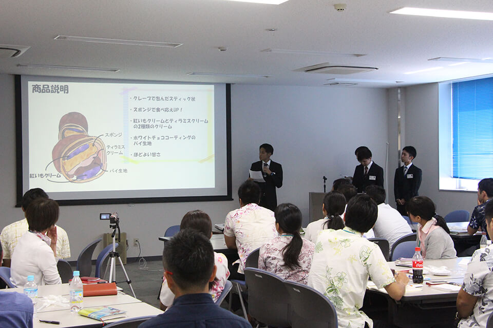 多くの商品を販売するには、社内での協力も必要!より多くの個数を発注してもらえるように、沖縄ファミリーマートのエリア営業担当に向けての商品と販促方法のプレゼンです。このプレゼンも点数化され、販売数・売上金額と合わせて重要な選考基準となるので、各チームも並々ならぬ気合が入ります!