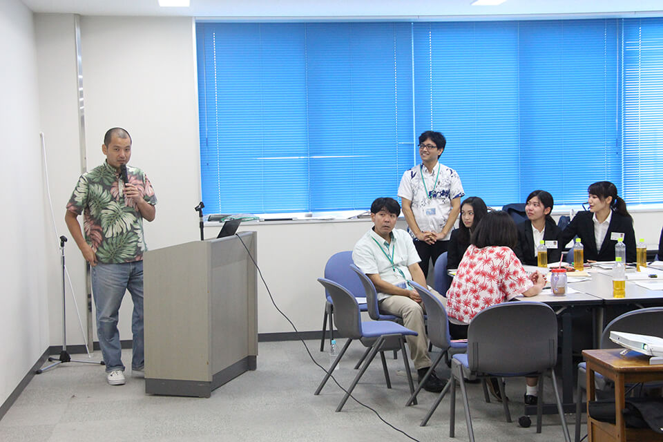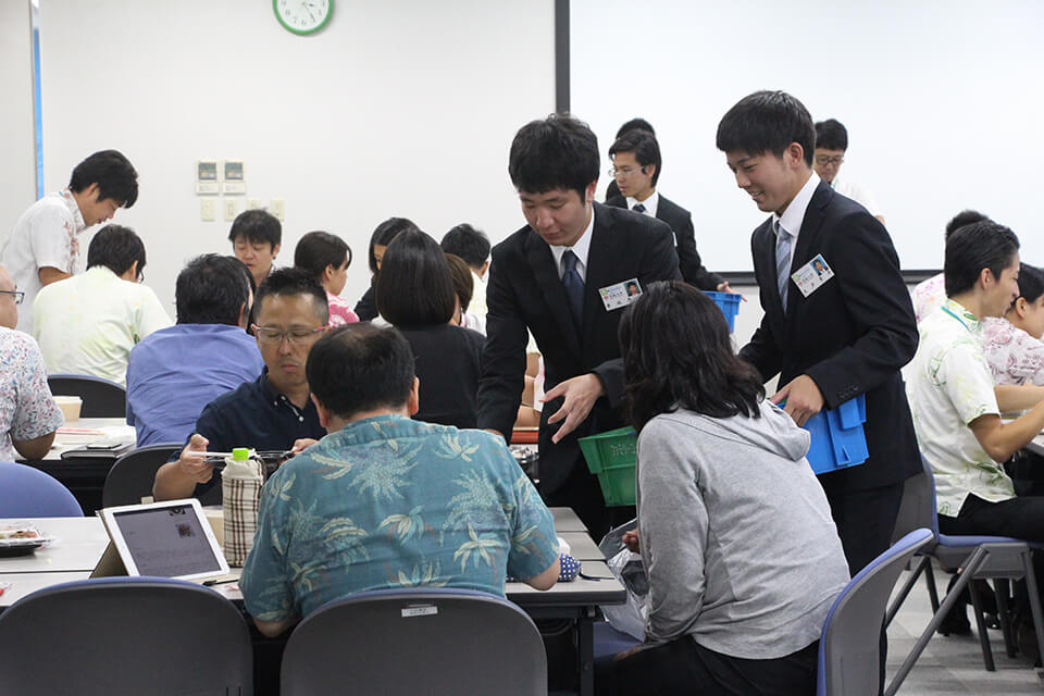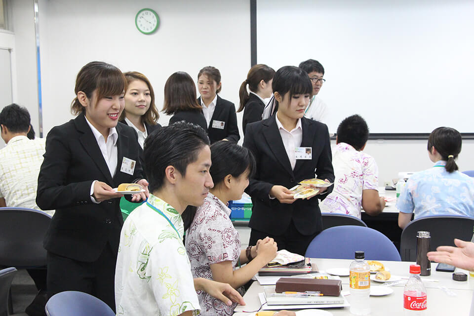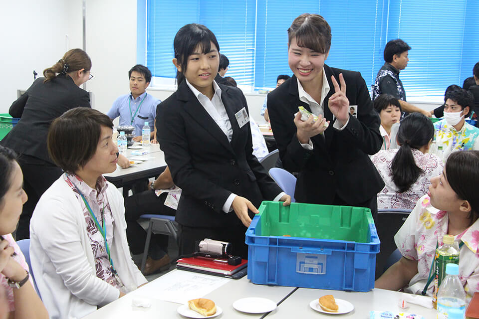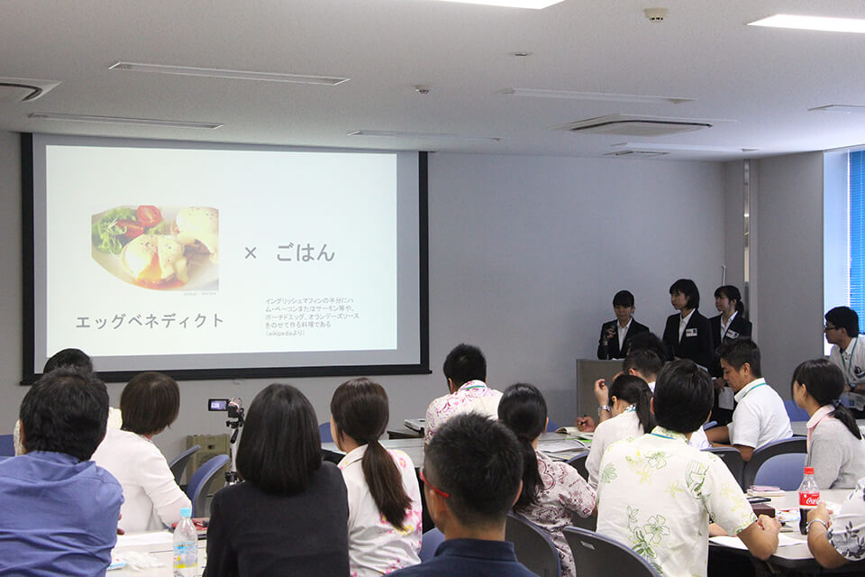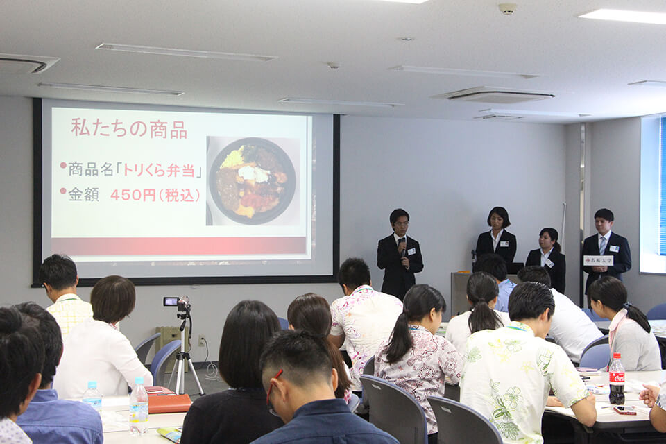 多くの商品を販売するには、社内での協力も必要!より多くの個数を発注してもらえるように、沖縄ファミリーマートのエリア営業担当に向けての商品と販促方法のプレゼンです。このプレゼンも点数化され、販売数・売上金額と合わせて重要な選考基準となるので、各チームも並々ならぬ気合が入ります!