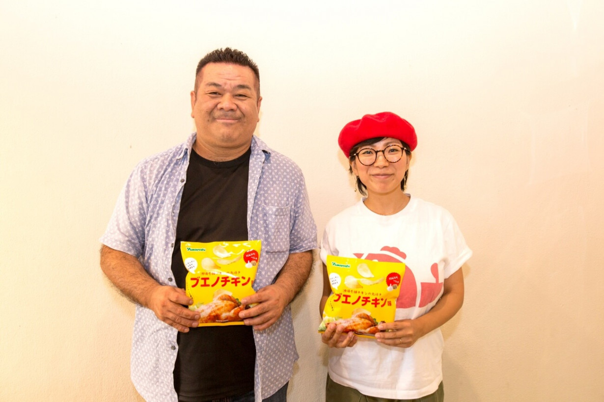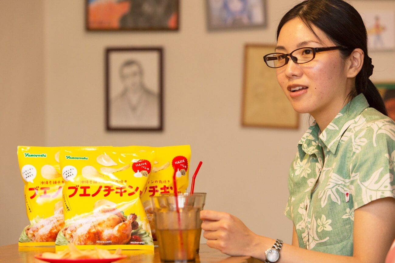 石垣 まず、沖縄の人はシシジョーグー(肉好き)なので、「肉系」のコラボ商品でいこうと考えていました。そこで、沖縄らしさもあるチキンの丸焼き、中でもみなさんに広く知れ渡っているブエノチキンさんとのコラボが浮かびました。ニンニクが効いた味もポテトチップスと相性が良いだろうと確信していましたし、食文化を南米から持ち帰ったというストーリーもあります。さらには、店舗の黄色の看板が一際目立ち、キャッチーだったので、これを丸ごと商品のパッケージにできたらという想いから、ブエノチキン普天間さんと浦添さんにお声掛けしました。