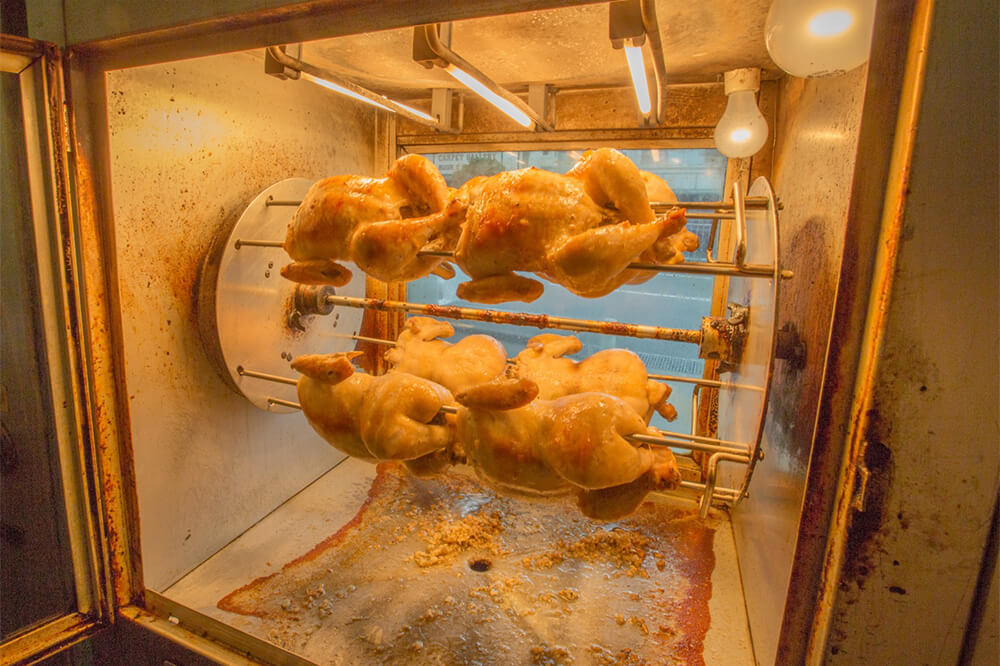 お店の外から見ることのできるチキンの丸焼きは思わず食欲をそそられる。