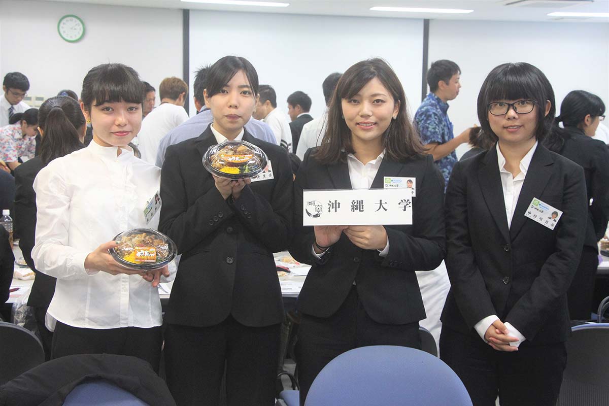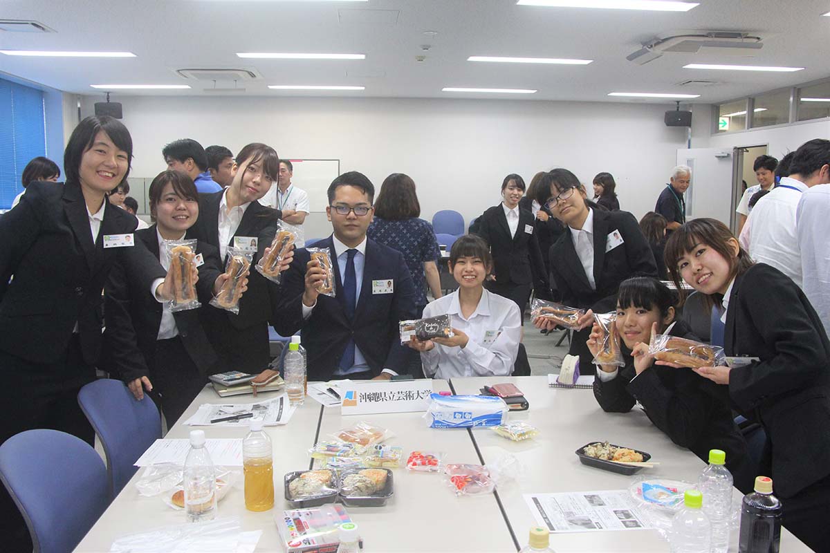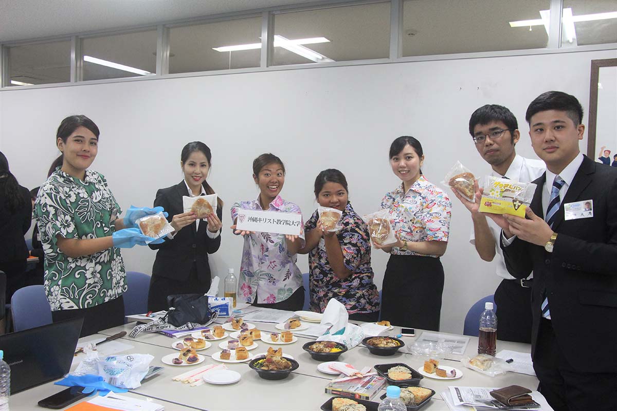 気になっているチームは?との問いかけに、沖縄県立芸術大学とキリスト教学院大学は互いに同じパンということもあり睨み合い。琉球大学と沖縄女子短期大学も、おにぎりで同じジャンルなので、相手の商品をしっかりと研究。