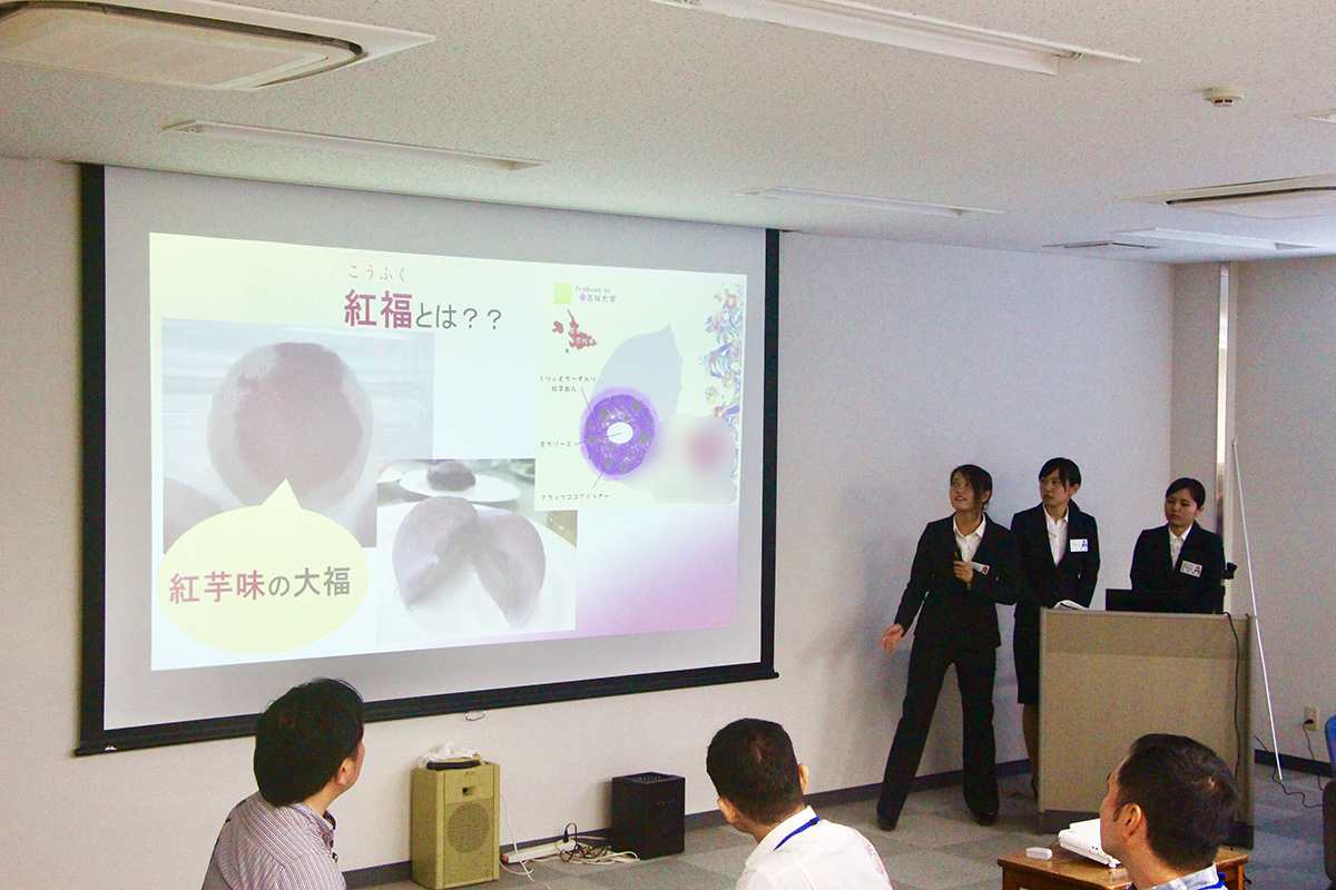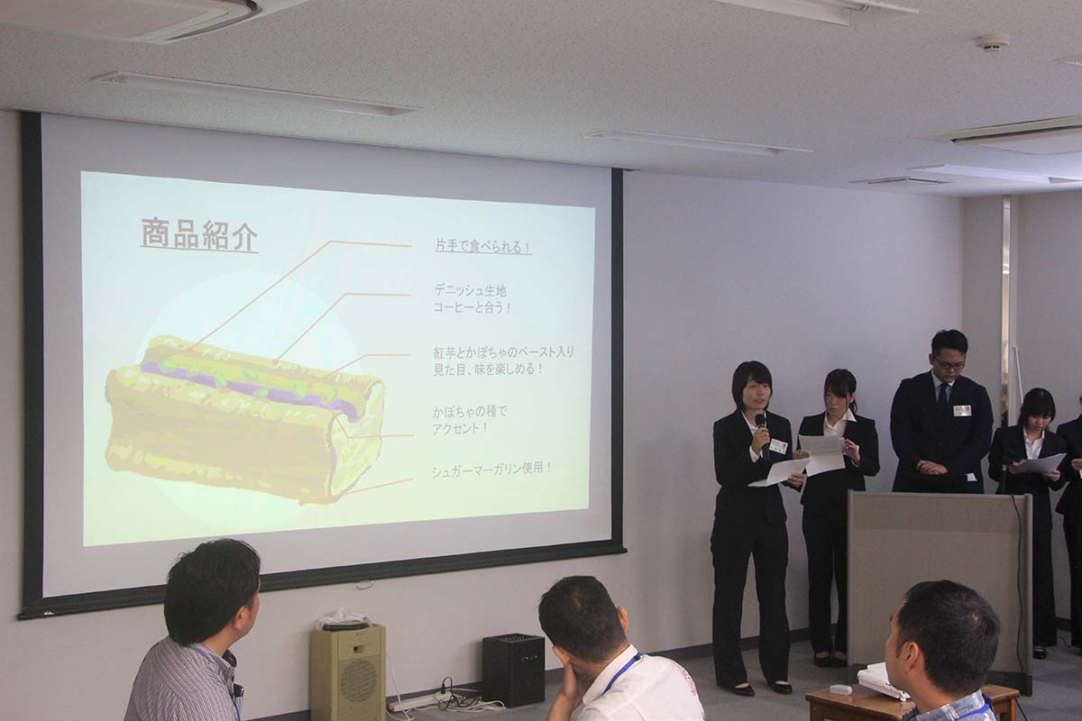 コンビニ業界の商品を引き合いに出して導いた市場状況から、紅芋スイーツと大福スイーツが人気を捉え開発に至ったという内容が説得力を持っていました。商品の製法や素材などを分かりやすく図解で示されていました。最後は開発メーカーのみなさんに感謝の気持ちを伝えて、絆を感じさせられました。