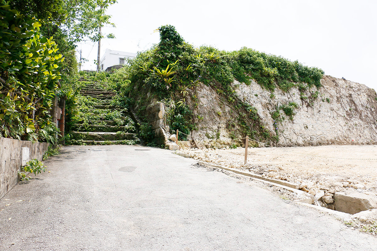 石碑と拝所らしき祠の右手、道を挟んだ先には立派な石段があり、階段を登った先には…! 何があったのでしょうか?すっかり更地です。多くのグスクが昔ながらの姿をそのまま留めているわけではありません。