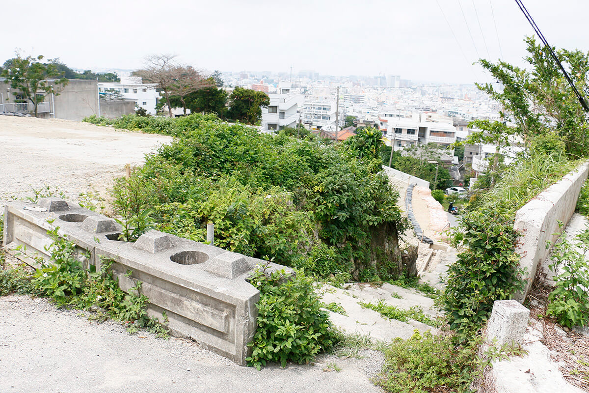 こちらは、現在西部プラザ公園として整備されています。テミグラグスクのあった場所「テミグラの杜」と、拝所や古墓が点在する「金満の杜」を東西につなぐ園路は「ウマチーロード」と呼ばれています。これがなんとも壮観で、さながら『万里の長城』です!