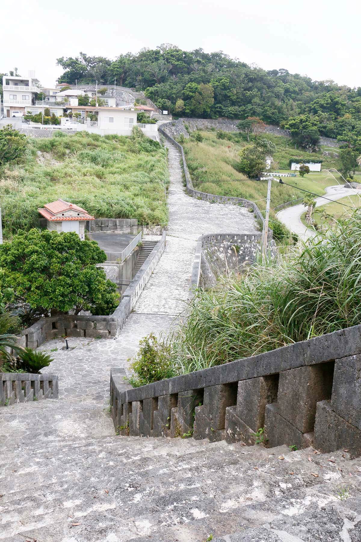 ウマチーロード自体は後世に建てられたものだと言いますが、すでに歴史を感じさせる風合いを帯びています。野鳥観察棟を配し美しく整備された園内を左手に見ながらウマチーロードを進んでいくと、テミグラの杜の頂上、テミグラグスクにたどり着きます。今は自然観察の森として整備されているテミグラの杜は古来「クサティムイ」と呼ばれ祭祀がおこなわれた御嶽の杜だそうです。