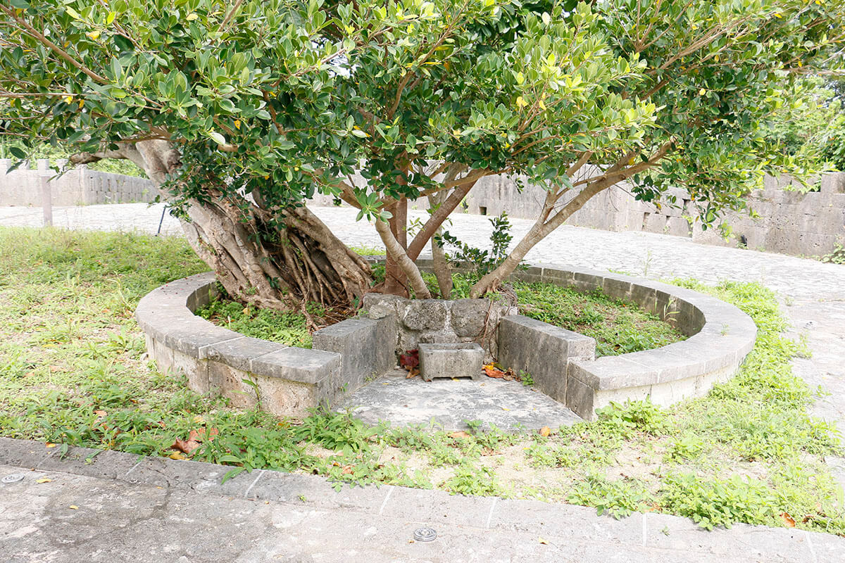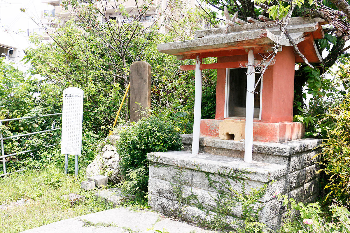 石田グスク(那覇市繁多川)は、住宅街の中にひっそりと佇んでいます。石碑の隣には祠があります。多くのグスクには御嶽(うたき)や拝所(うがんじゅ)があり、琉球の神様や神様となった祖先に会える場所なのです。城という漢字があてられているグスクですが、いわゆる戦いのためのお城としての機能だけではなく、神様がまつられた聖なる場所、信仰の対象でもあったとされています。
