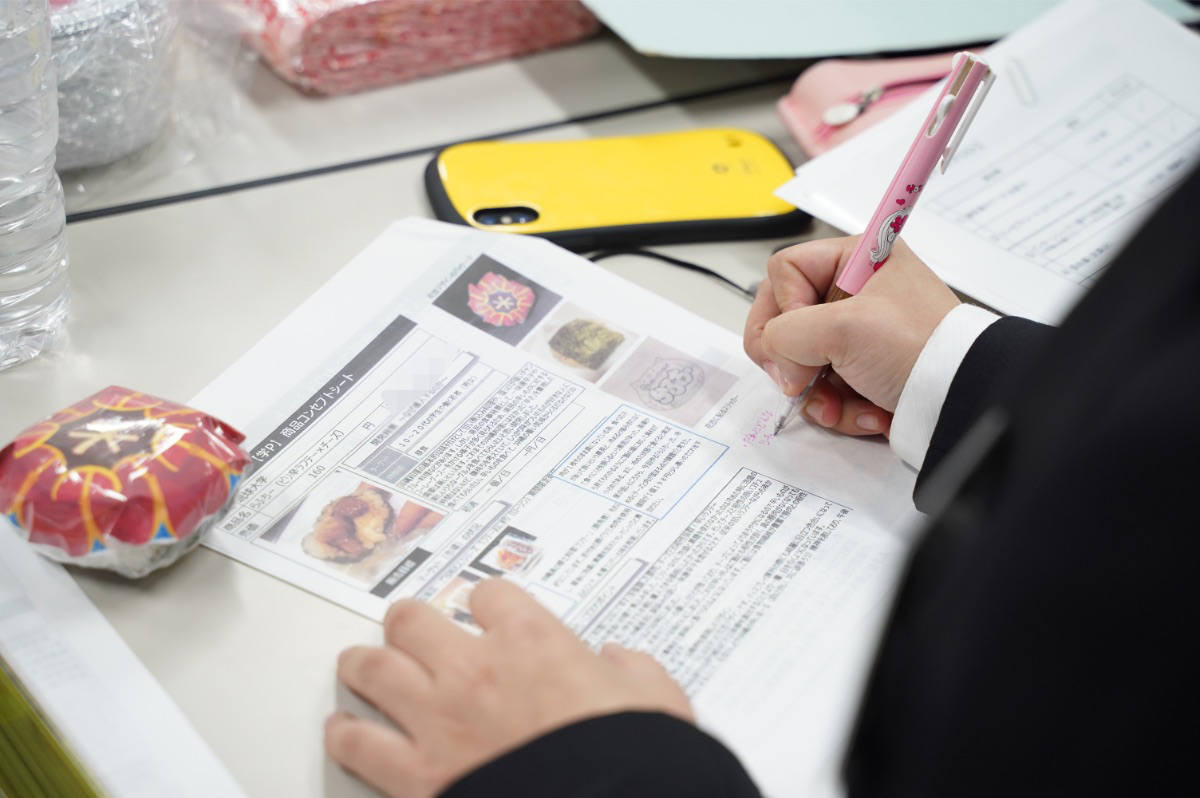 学生たちが自ら作った試作品とコンセプトシートを突き合わせながら、担当者に試食してもらい共に方向性を定めていきます。コンセプトシートの作成は最も重要な工程で、時間を掛ける部分だそうです。